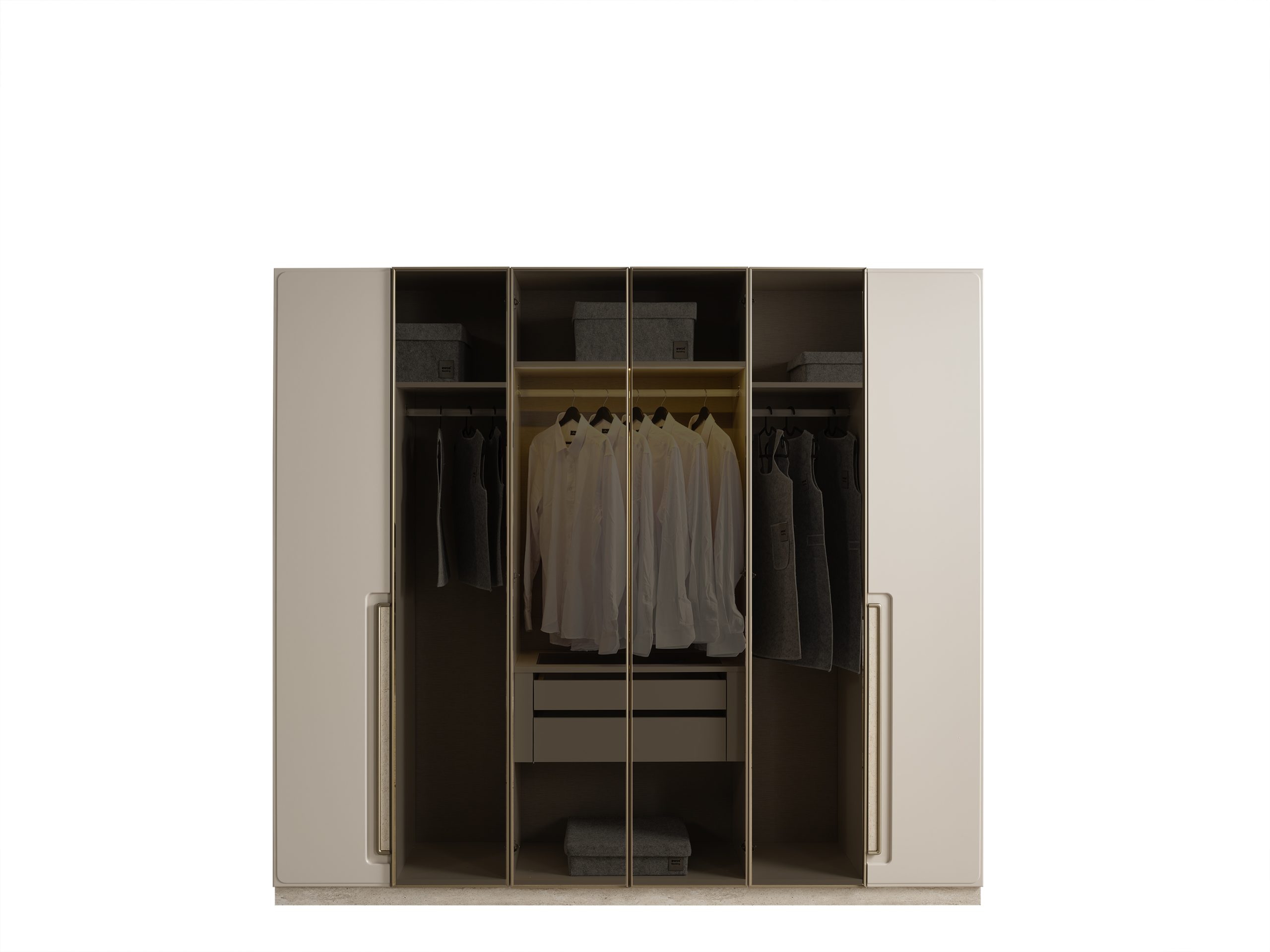 Tasarım açısından, Akkor Dolap’ın merkezinde yer alan iki adet boydan boya dolap kapak, odaya derinlik katarken, kullanışlı bir giyinme alanı sunar. Bu dolap kapaklar, dolap odasının ferah ve aydınlık görünmesine de yardımcı olur. Yanlarda bulunan ikişer adet kapak, dolabın simetrik ve dengeli yapısını tamamlar. Dış kapaklarda kullanılan uzun, bronz tonlarında ve hafif dokulu yüzeye sahip girintili kulplar, dolabın modern çizgisine zarif bir detay eklerken, kullanım kolaylığı sağlar. Bu entegre kulp tasarımı, minimalist görünümü destekler ve dolabın genel şıklığını artırır.