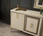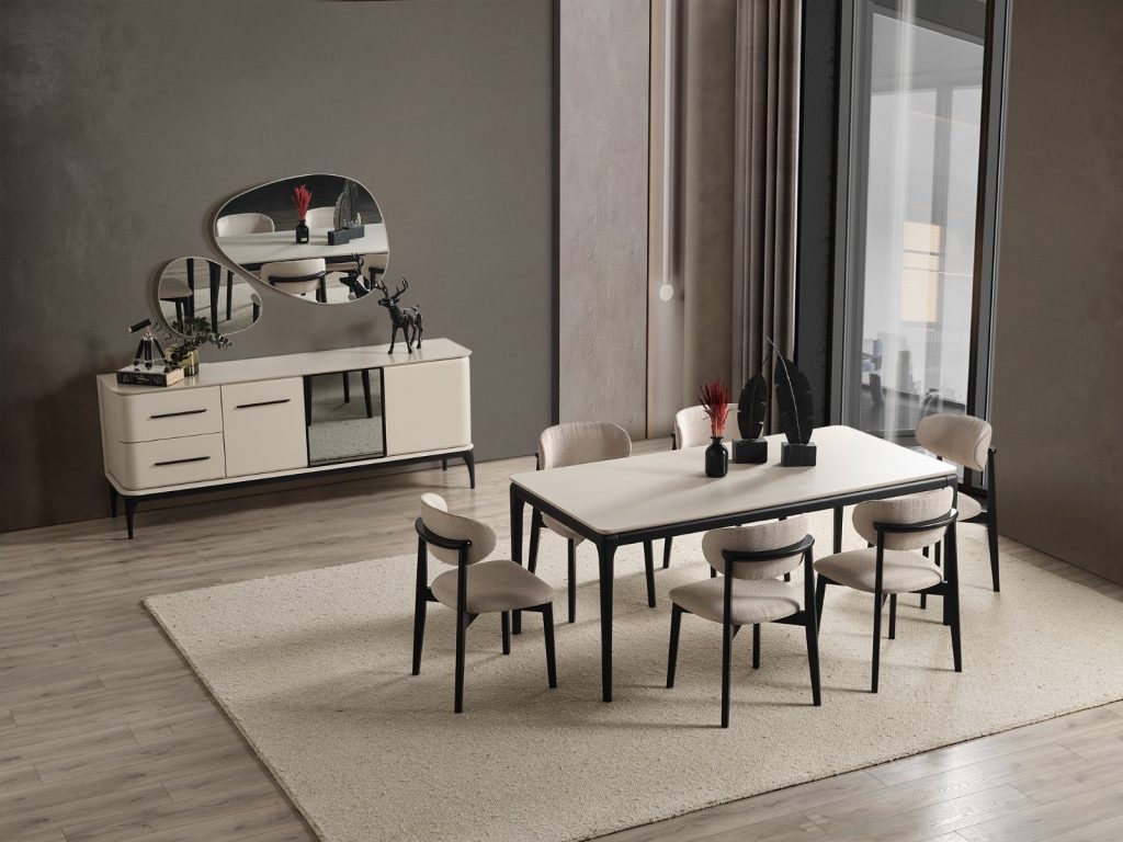 Ürünün görünümü, modern tasarım anlayışını yansıtır. Yemek masası, zarif bir görünüme sahip olup, metal detaylarla zenginleştirilmiştir. Sandalyeler, ergonomik yapısıyla konfor sunarken, modern hatlarıyla takıma uyum sağlar. Ayrıca, yemek odası takımı ve aynası da takıma bütünlük katarak yemek odanıza şıklık kazandırır.