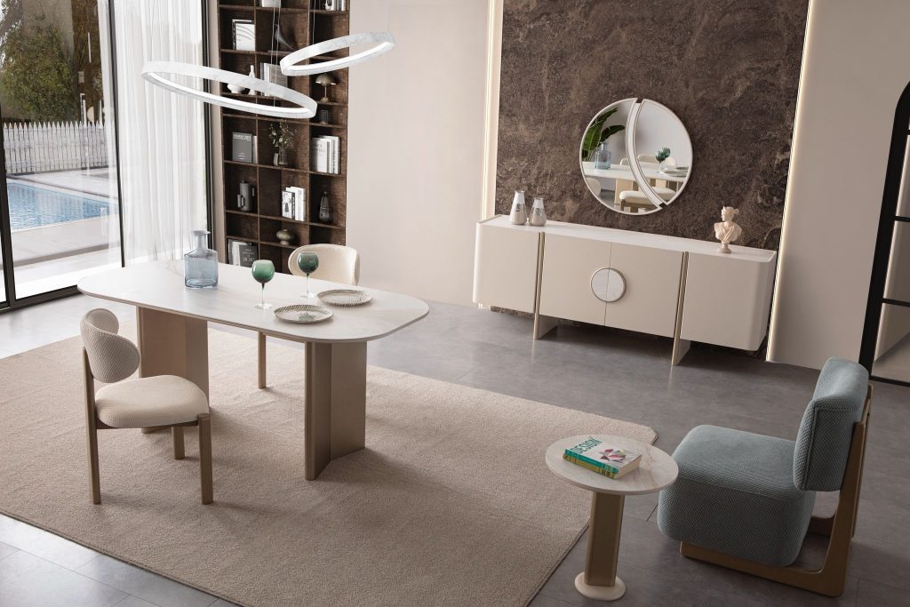 Bahar Yemek Odası Takımı, modern ve sofistike bir atmosfer yaratmak isteyenler için özenle tasarlanmıştır. Takım, zarif çizgileri, özenle seçilmiş detayları ve fonksiyonel yapısıyla dikkat çekmektedir.