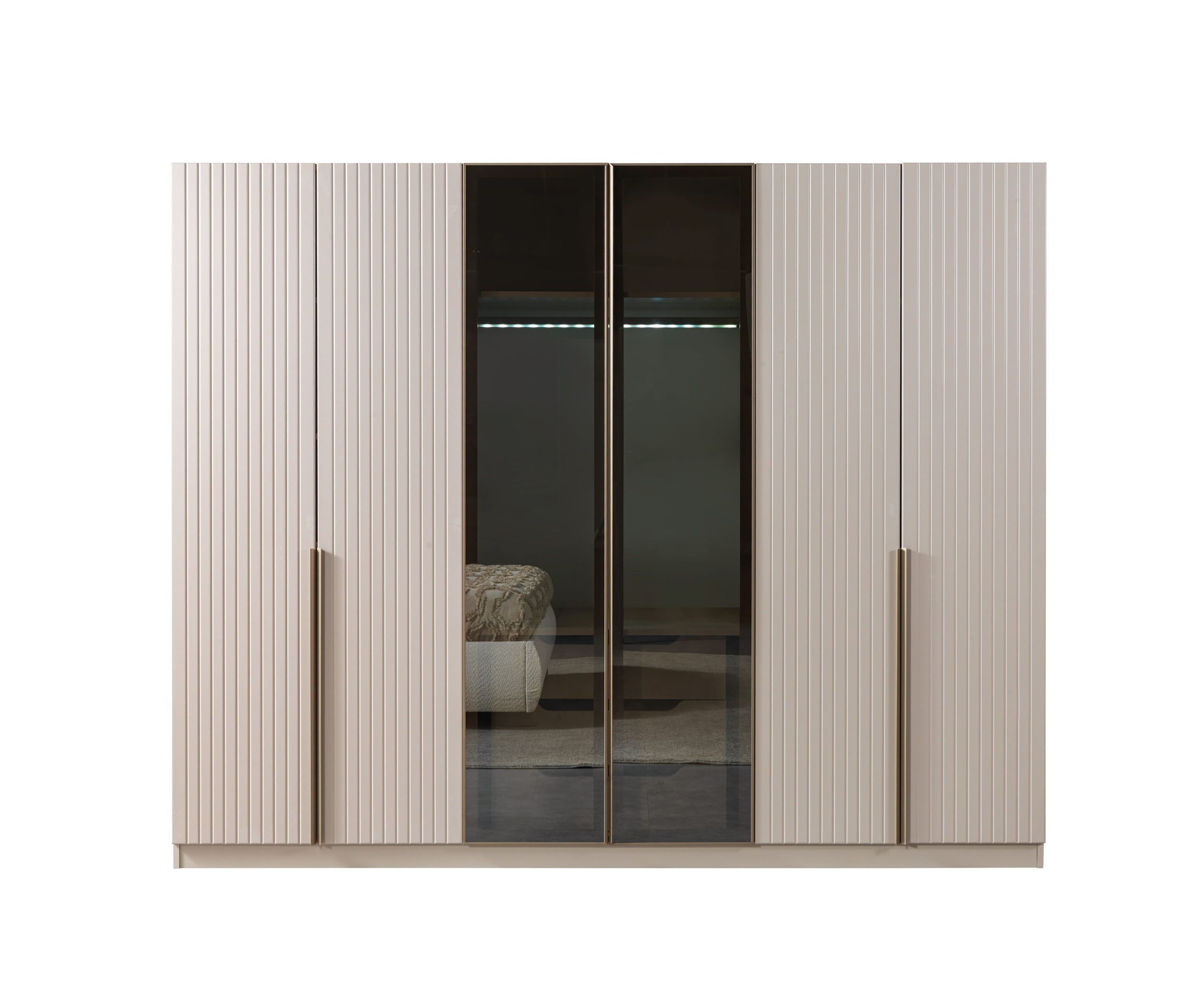 Gardırobun yan kapaklarında yer alan çizgili desen, ürüne modern ve sofistike bir kimlik kazandırır. Bu dokulu yüzey, ışığı farklı açılardan yansıtarak odanızda görsel bir zenginlik yaratır. Tasarımın odak noktasında ise, odaya derinlik ve ferahlık hissi katan bronz renkli füme aynalı orta kapaklar bulunur.[1][2] Bu aynalar, hem giyinirken size yardımcı olur hem de mekanın daha geniş algılanmasını sağlar. Uzun ve şık tasarıma sahip metal kulplar, gardırobun minimalist çizgisini tamamlayarak lüks bir görünüm sunar.