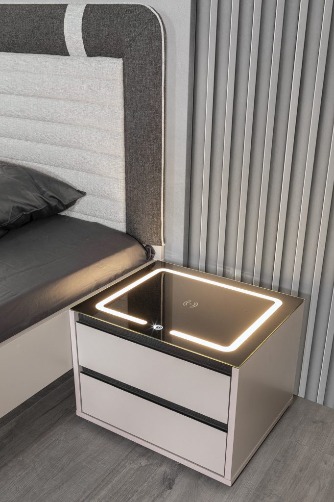Ürünün görünüşü, koyu gri/antrasit rengi ve mat yüzeyiyle dikkat çeker. Keskin ve temiz hatları, minimalist bir estetik anlayışını yansıtır. Komidin, üst kısımda geniş bir çekmece ve hemen altında açık bir depolama alanı sunarak hem gizli hem de kolay erişilebilir saklama imkanları sağlar. Bu çekmece, kişisel eşyalar, kitaplar veya elektronik cihazlar için geniş bir alan sunarken, açık raf bölümü dekoratif objeler veya sık kullanılan eşyalar için pratik bir yerleşim sağlar.