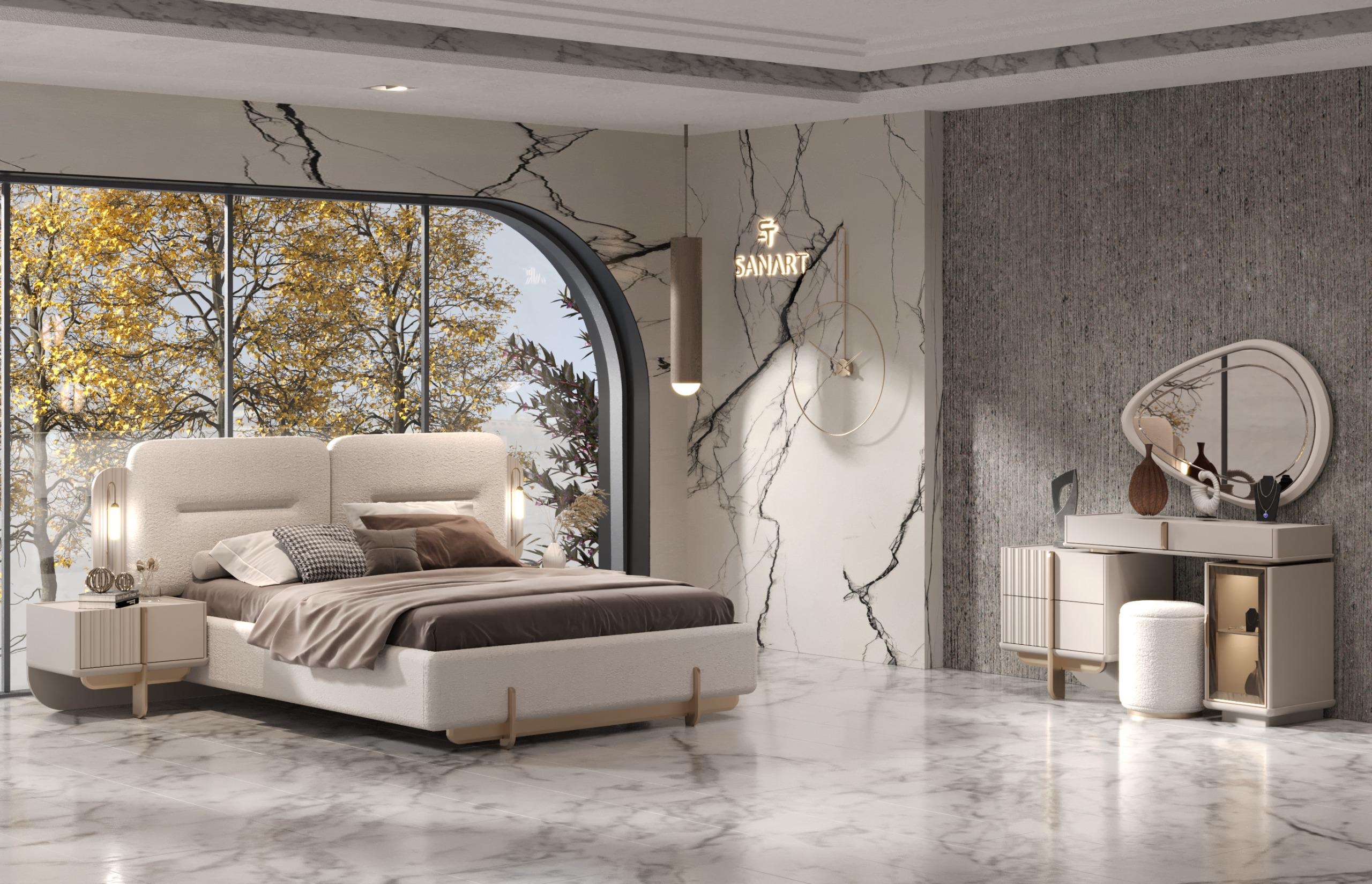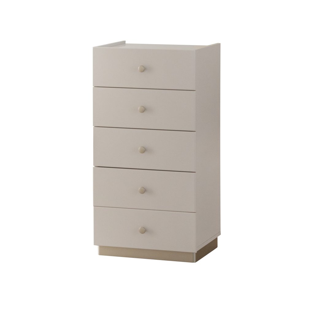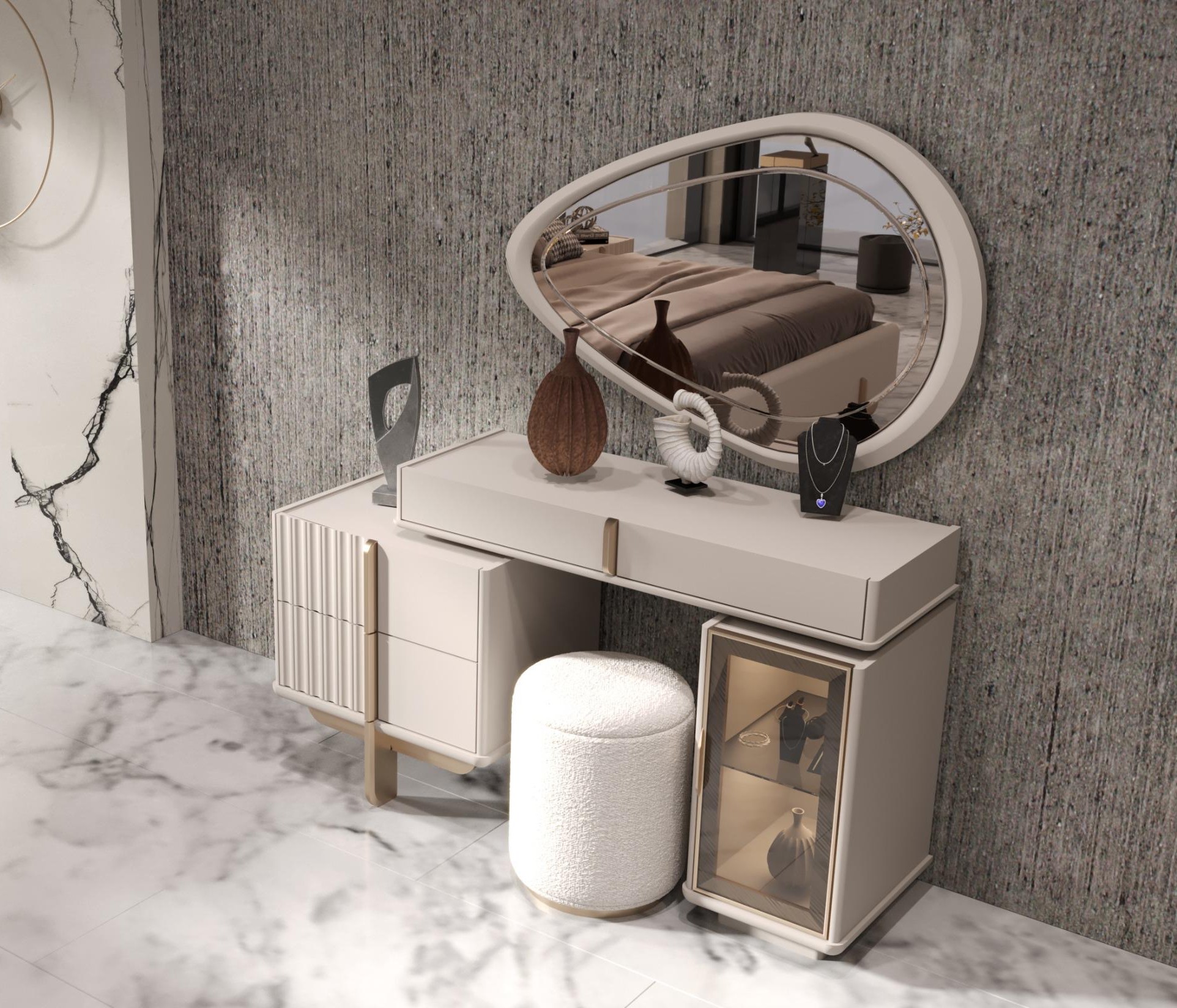 Eyfel Şifonyer, şifonyer odanıza modern bir dokunuş getiren, zarif ve fonksiyonel bir tasarıma sahiptir. Krem tonlarındaki MDF malzeme, şifonyere sofistike bir hava katarken, altın rengi detaylar lüks bir görünüm sunar. Dikey çizgili çekmece önleri ve zarif ayakları, şifonyerin estetik bütünlüğünü tamamlar.