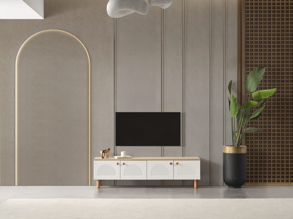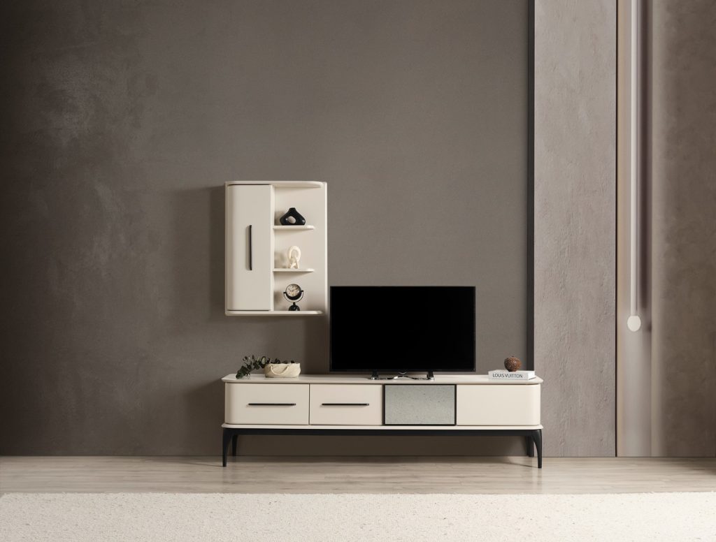 Eyfel tv ünitesi, modern ve minimalist bir tasarıma sahip, yemek odaları için özel olarak tasarlanmış bir TV ünitesidir. tv ünitesi, krem rengi tonları ve zarif detaylarıyla dikkat çeker. Dikey çizgili yüzeyler ve altın rengi detaylar, dolaba sofistike bir hava katarken, camlı bölmeler içindeki eşyaların sergilenmesine olanak tanır. Bu tv ünitesi, hem estetik hem de fonksiyonel ihtiyaçlarınızı karşılamak üzere tasarlanmıştır.