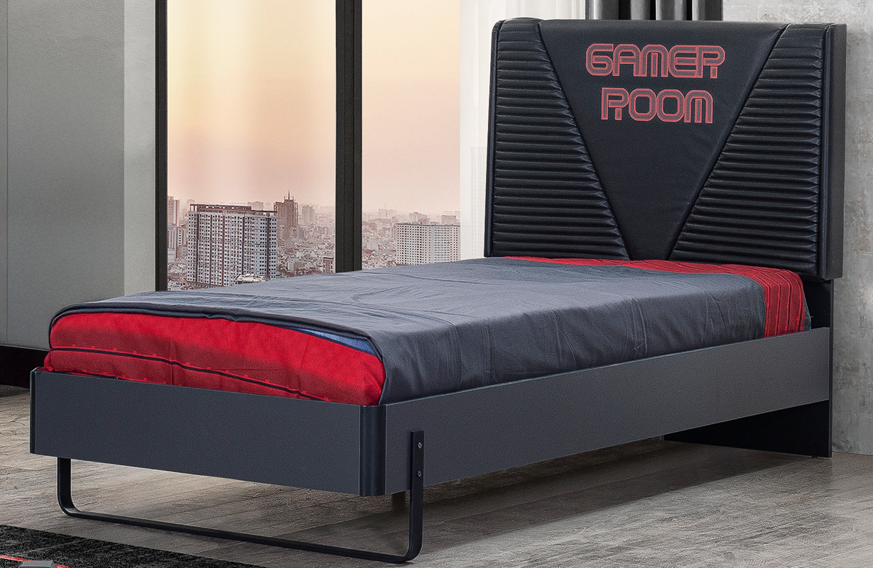 Gamer başlık + karyola, gençlerin dinamik dünyasına hitap eden modern ve tematik bir tasarıma sahiptir. Koyu gri veya antrasit tonlarındaki sade karyola iskeleti, yatağa çağdaş ve şık bir görünüm kazandırır. Yatağın en çarpıcı özelliği, siyah renkteki döşemeli başlığıdır. Bu başlık, ortasında “GAMER ROOM” yazısıyla öne çıkar ve bu yazı, canlı kırmızı/turuncu neon benzeri bir fontla tasarlanmıştır. Başlığın yan kısımlarında yer alan yatay çizgili (fitilli) detaylar, V şeklinde bir form oluşturarak tasarıma derinlik ve hareket katar.