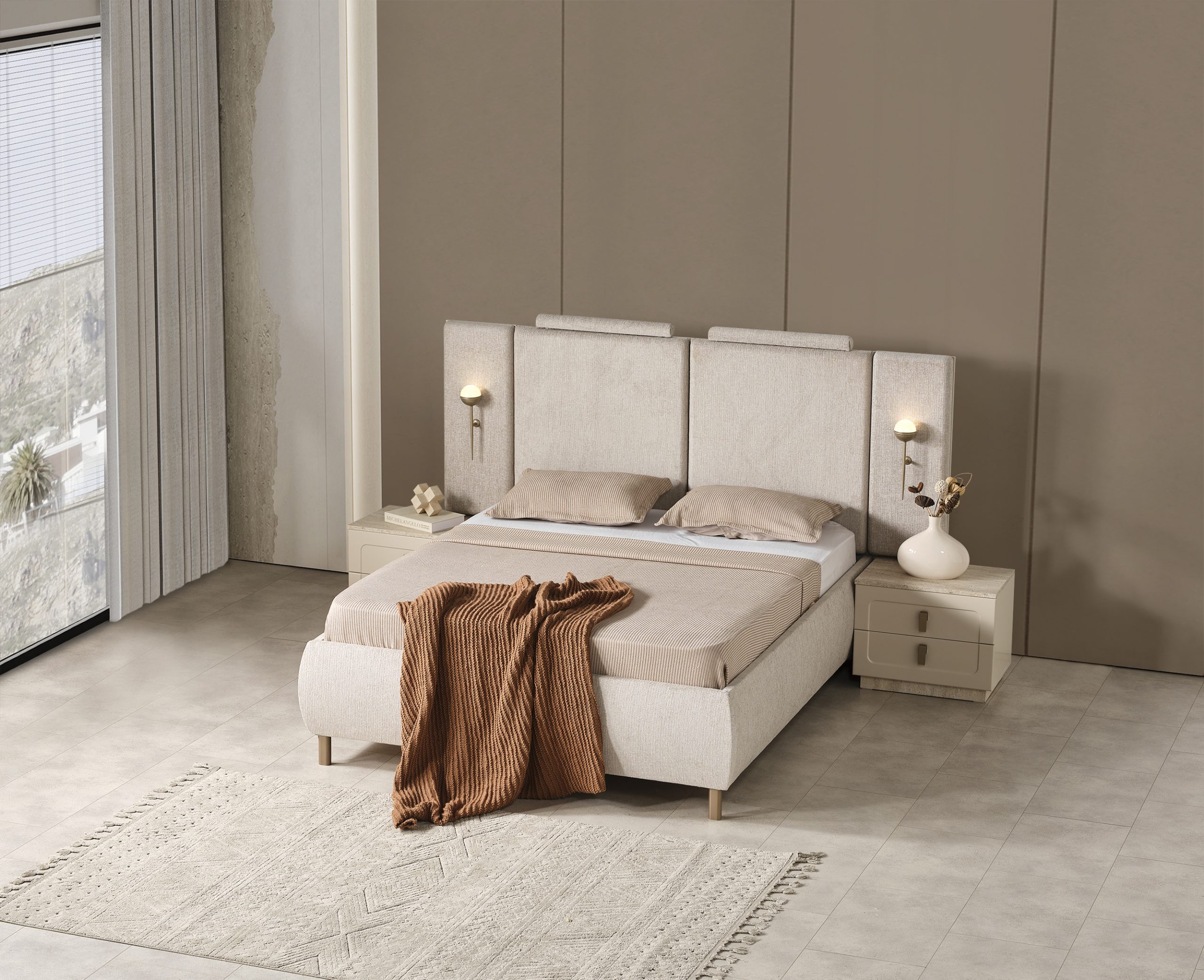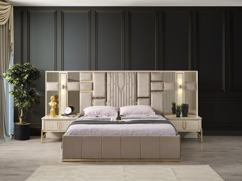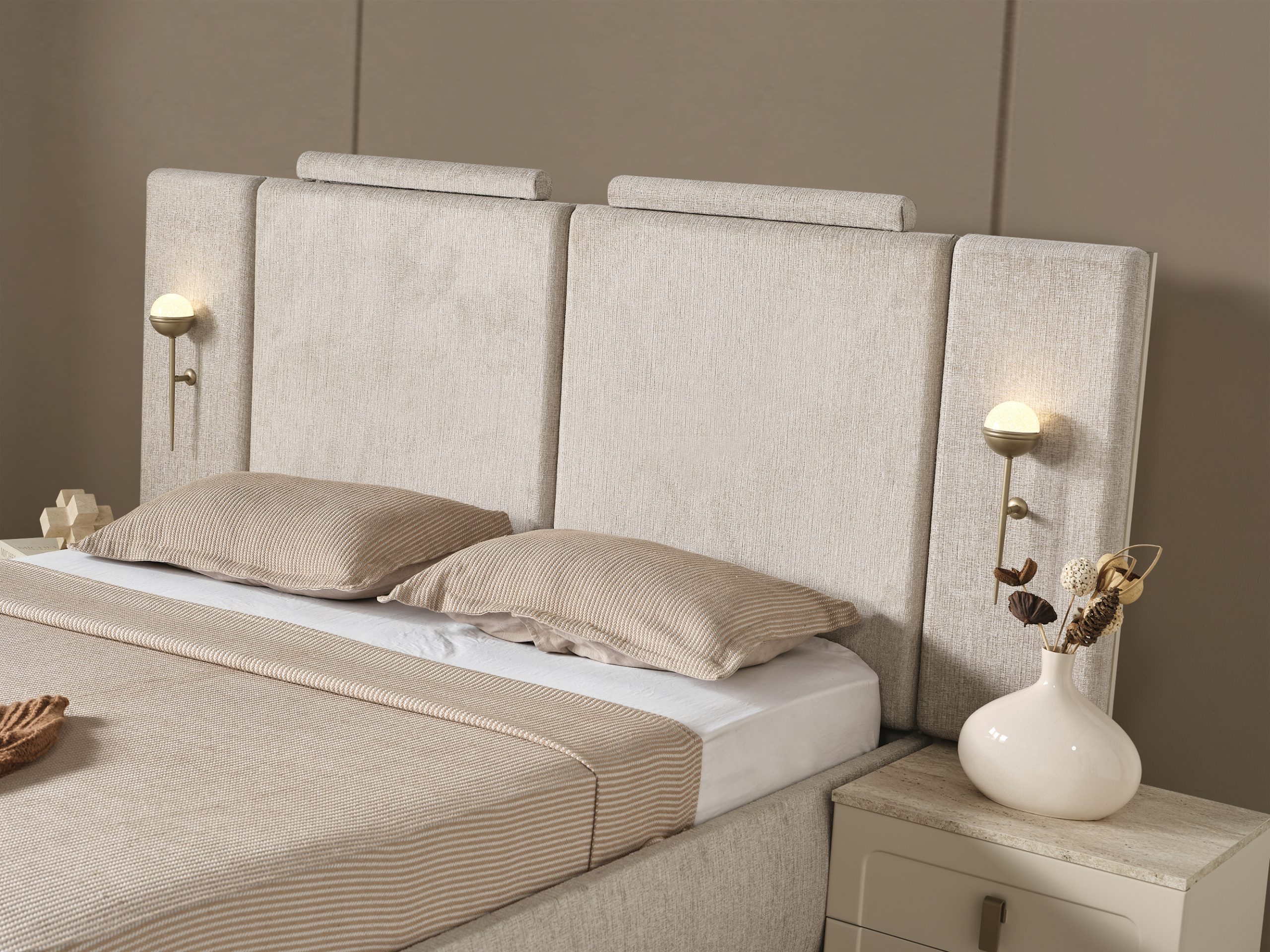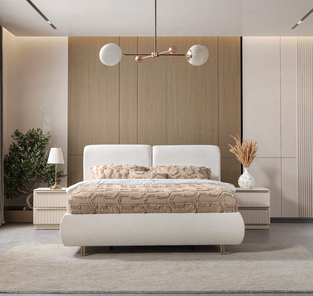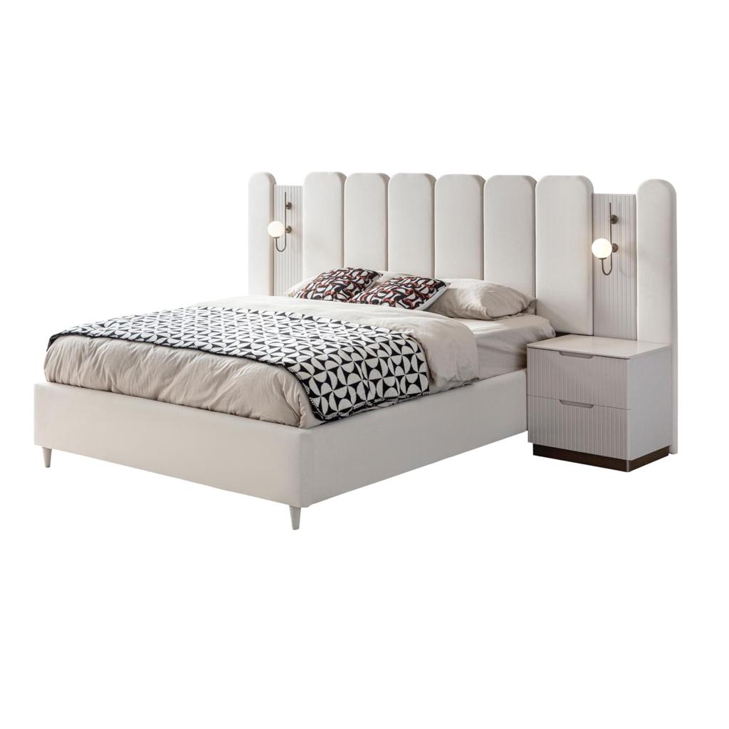 Bu şık karyola + başlık, modern stilin minimalist çizgisini yansıtır. Başlığın dikey panelleri ve yumuşak dokusu, görsel bir zenginlik sunarken, nötr renk tonları her türlü dekorasyona kolayca uyum sağlar. Yatağın yerden yüksek ayakları, temizliği kolaylaştırırken, modern görünümünü destekler.