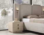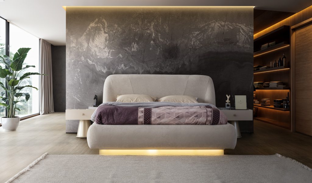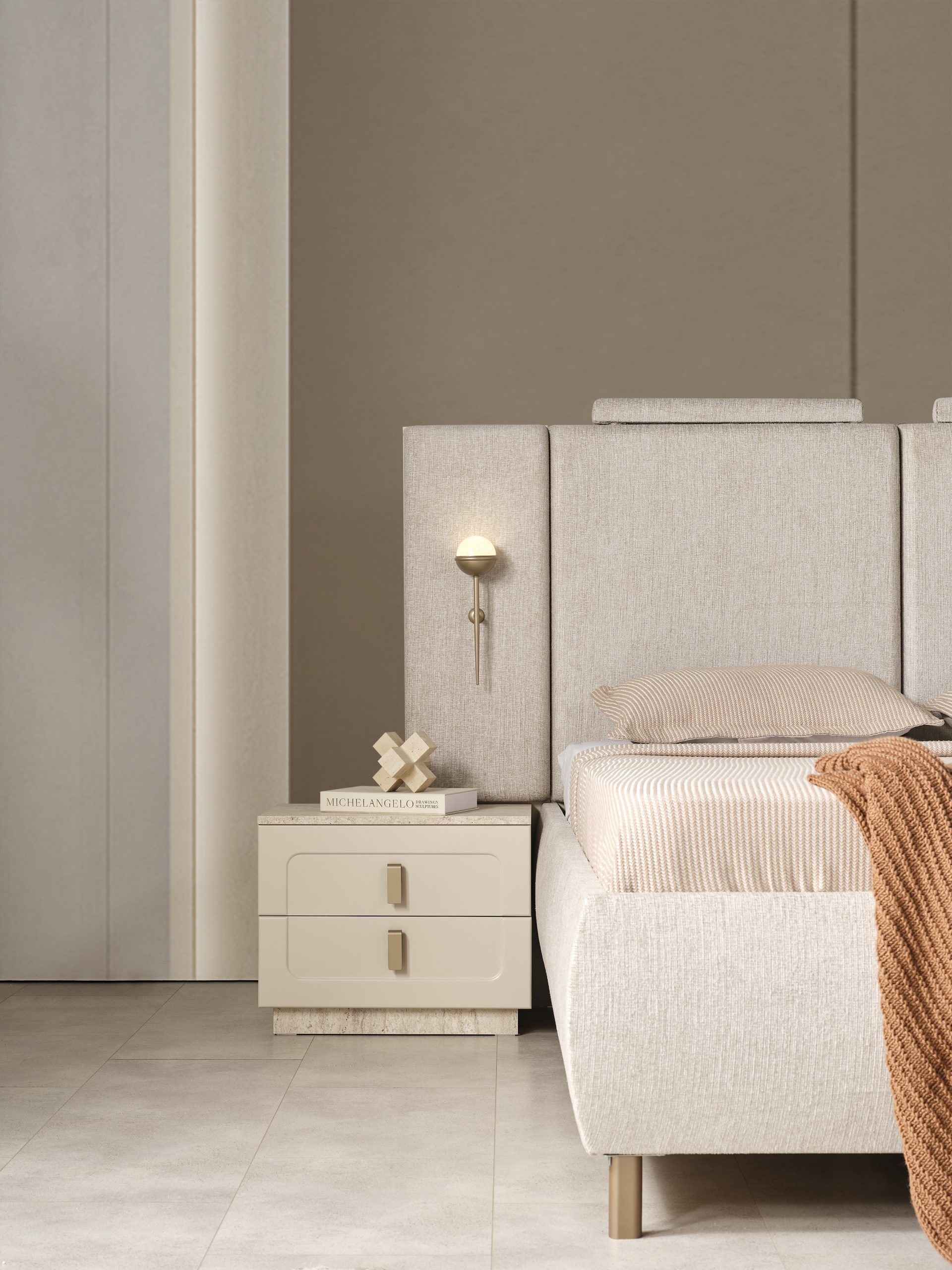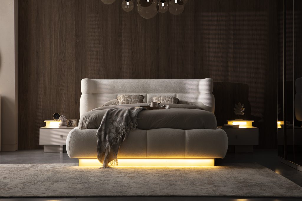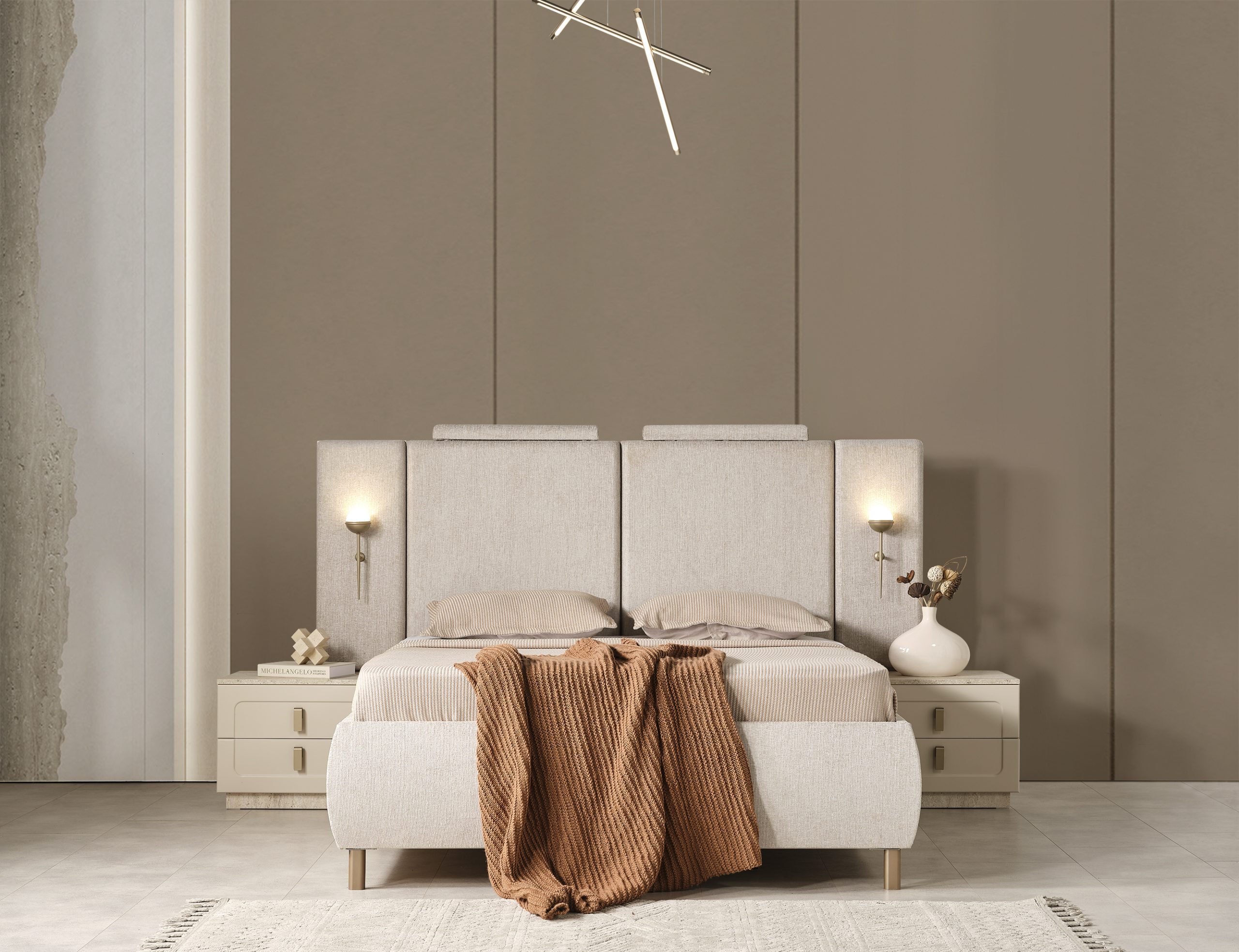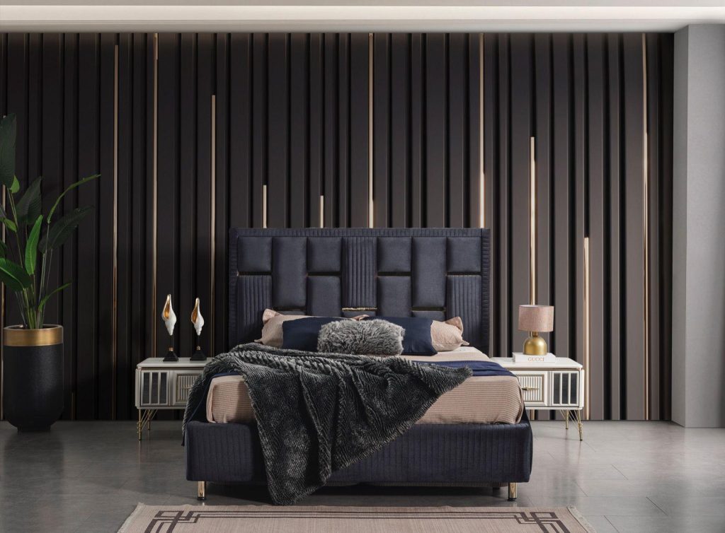 Bu şık karyola + başlık, modern stilin minimalist çizgisini yansıtır. Başlığın dikey panelleri ve yumuşak dokusu, görsel bir zenginlik sunarken, nötr renk tonları her türlü dekorasyona kolayca uyum sağlar. Yatağın yerden yüksek ayakları, temizliği kolaylaştırırken, modern görünümünü destekler.
