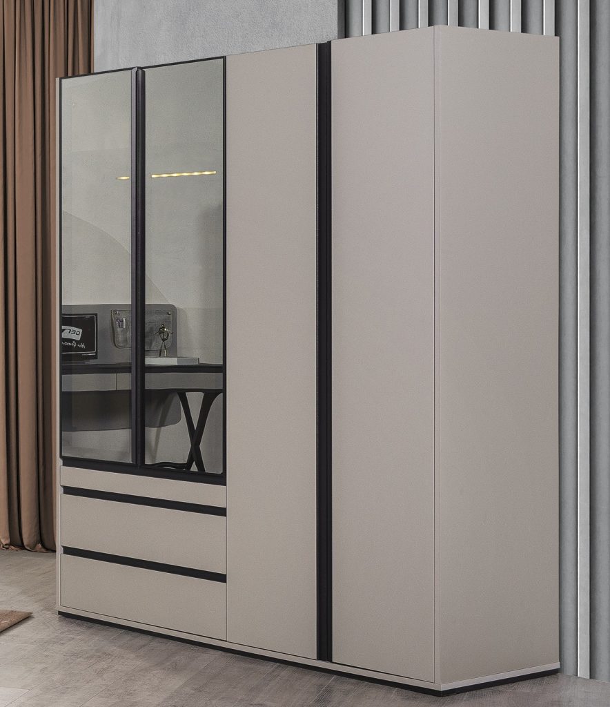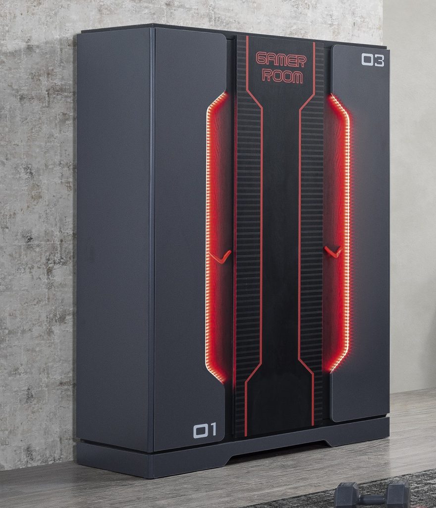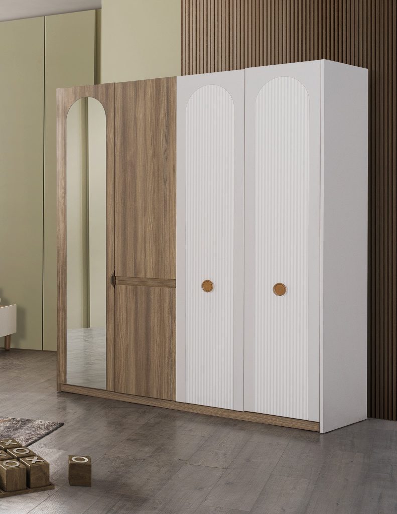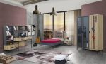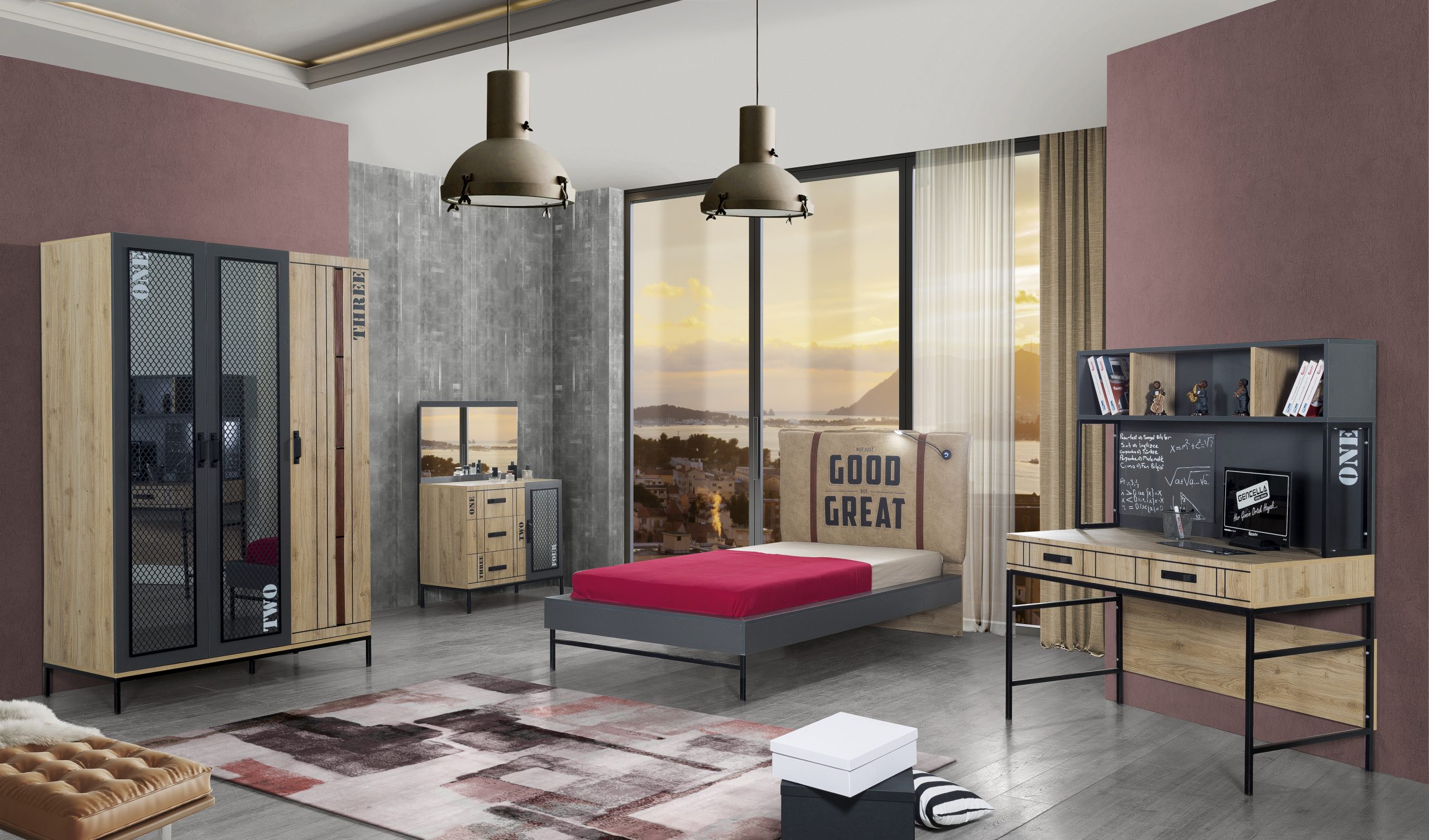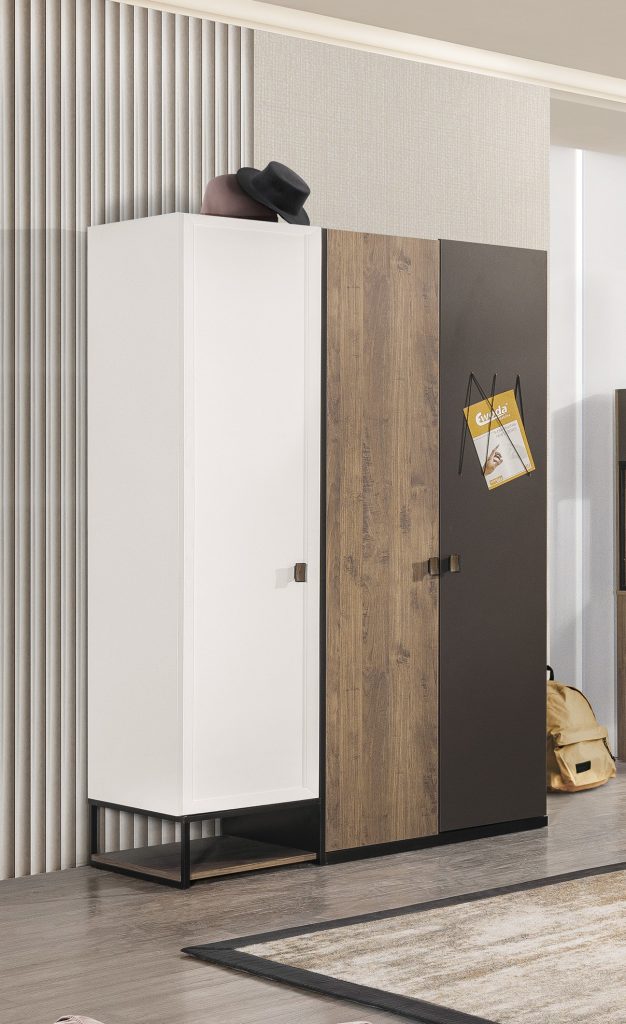 Loft Dolap, genç odaları için özel olarak tasarlanmış, endüstriyel estetiği modern çizgilerle birleştiren dikkat çekici bir depolama çözümüdür. Ürünün gövdesi ve sağ kanadı, doğal ahşap dokusunu yansıtan lamine malzemeden üretilmiştir; bu da odaya sıcak ve davetkar bir hava katmaktadır. Sağ kapakta dikey ahşap paneller ve kahverengi şerit detayları ile birlikte ‘THREE’ yazısı, tasarıma özgün bir karakter kazandırır. Orta ve sol kanatlarda ise koyu renkli metal çerçeveler içerisinde endüstriyel tel örgü (mesh) paneller kullanılmıştır; bu şeffaf detaylar, dolabın içindeki düzeni hafifçe sergilerken, odanın genel ambiyansına modern bir dokunuş ekler. Sol kapakta ‘ONE’ ve alt kısımda ‘TWO’ yazıları, ürünün genç ve dinamik ruhunu vurgular. Tüm kapaklar, kolay açılıp kapanabilen dayanıklı siyah metal kulplarla tamamlanmıştır. Dolabın alt kısmında yer alan ince, sağlam metal ayaklar, hem ürüne hafif ve zarif bir duruş kazandırır hem de temizliği kolaylaştırır. Loft Dolap, sağlam lamine ahşap ve dayanıklı metalin mükemmel uyumuyla, hem estetik hem de fonksiyonellik açısından genç odalarının vazgeçilmez bir parçası olmaya adaydır. Geniş iç hacmi sayesinde kıyafetler, aksesuarlar ve kişisel eşyalar için düzenli bir saklama alanı sunar.