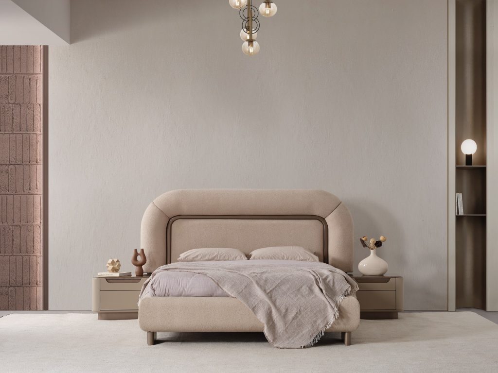 Yatağın başlığı, yumuşak dokulu kumaşla kaplanmış olup, dinlendirici bir okuma köşesi veya rahat bir yaslanma alanı sunar. Başlığın kıvrımlı hatları ve zarif dikiş detayları, yatağın klasik estetiğini vurgular. Yatağın çerçevesi, dayanıklı ahşap malzemeden üretilmiştir ve krem tonlarındaki boyasıyla odanıza sıcak bir hava katar. Çerçevenin üst kısmında yer alan ahşap detaylar, tasarıma ayrı bir zenginlik katar.