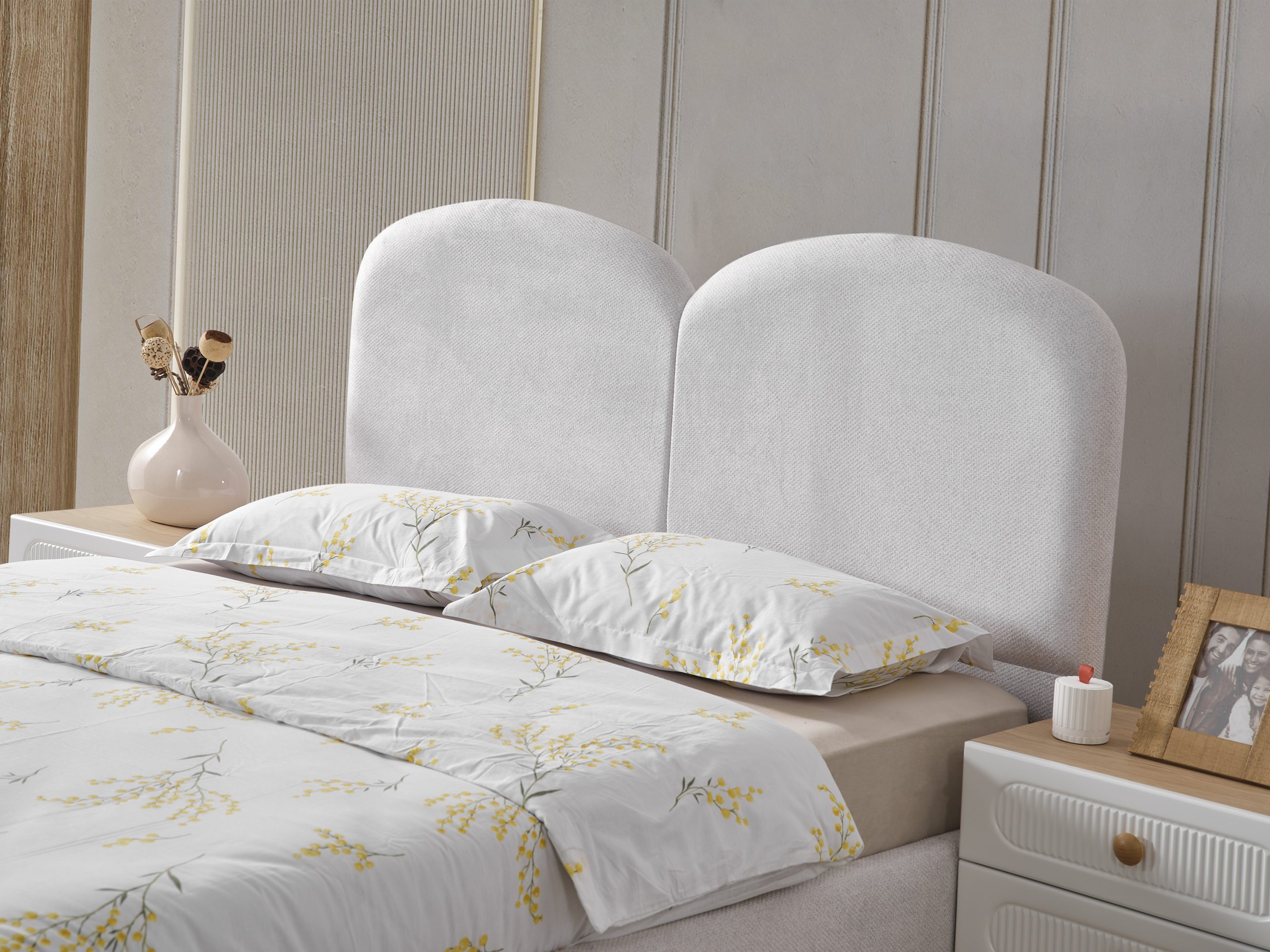 Tasarım özellikleri incelendiğinde, Nergis karyola + başlık’ın en dikkat çekici öğesi, iki ayrı, simetrik ve kavisli panodan oluşan zarif başlığıdır. Bu yuvarlak hatlı başlık, odaya yumuşaklık ve davetkar bir his katarken, arkasına yaslanmak için de ideal bir destek sunar. Başlığın ve karyola bazasının tamamı, görseldeki gibi açık bej veya açık gri tonlarında, yüksek kaliteli kumaş ile döşenmiştir. Bu döşemelik kumaş, dokusal bir derinlik sunarak ürünün lüks algısını pekiştirir.