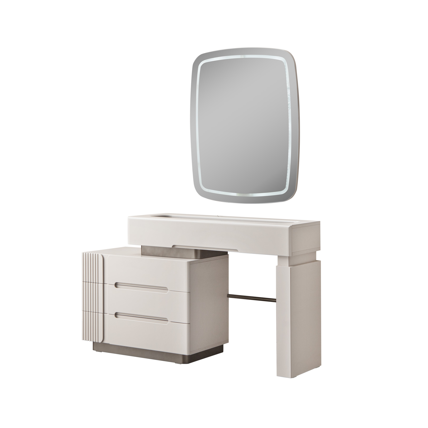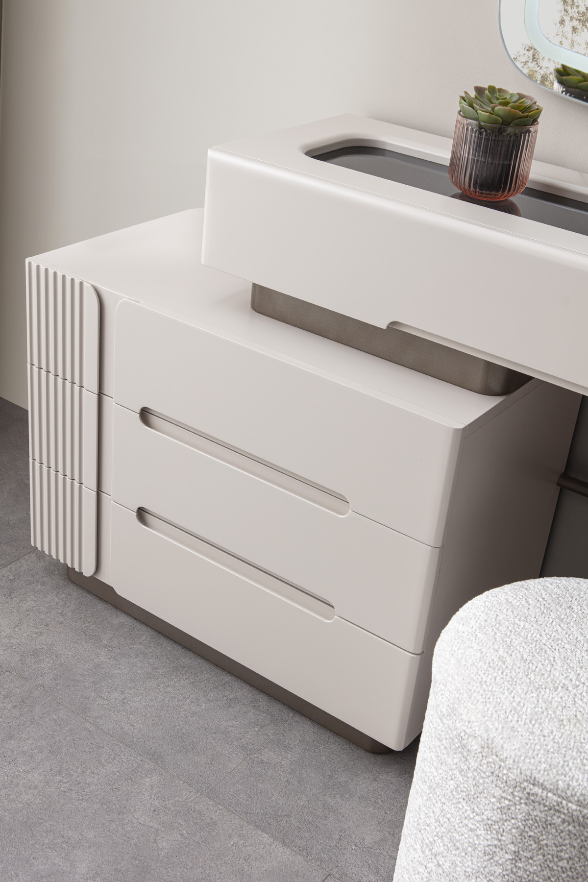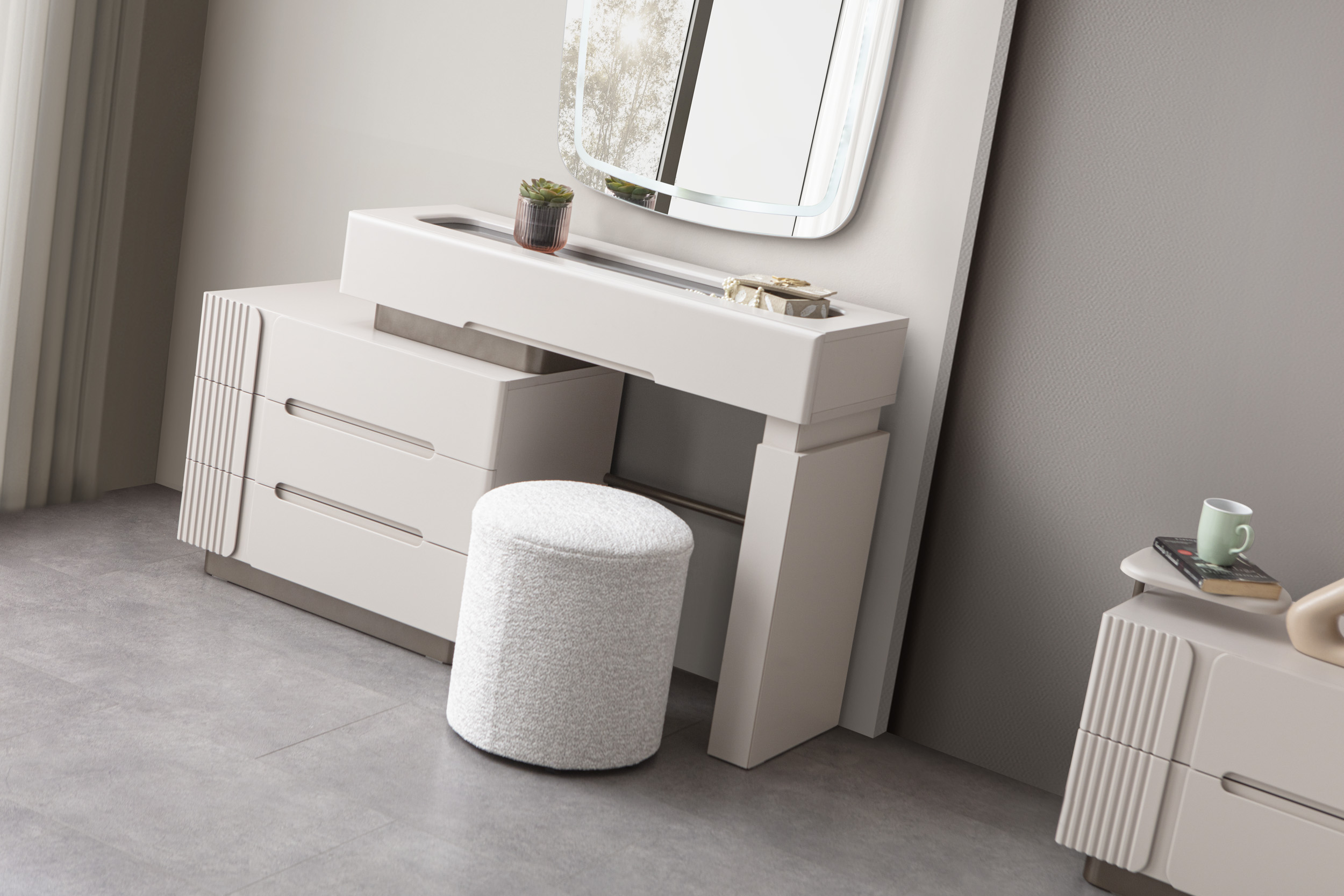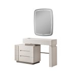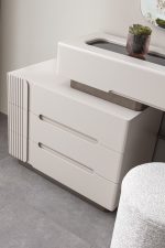 Nova makyaj masası, modern estetiği ve kullanışlı tasarımı ile öne çıkan bir şifonyerli şifonyerdır. şifonyer odanızın atmosferini zenginleştiren bu zarif mobilya, güzellik ve bakım ritüellerinizi daha keyifli hale getirir. Krem tonlarındaki MDF malzeme, masaya sıcak ve davetkar bir görünüm kazandırırken, modern çizgileriyle de çağdaş bir dokunuş sunar. Şifonyer bölümünde yer alan çekmeceler, makyaj malzemelerinizi, takılarınızı ve diğer kişisel eşyalarınızı düzenli bir şekilde saklamanız için geniş depolama alanı sağlar. Çekmecelerin üzerindeki modern detaylar ve dikey çizgiler, masanın genel estetiğini tamamlar. şifonyer yüzeyi, makyaj yaparken veya kişisel bakımınızı gerçekleştirirken size geniş ve rahat bir çalışma alanı sunar. Duvara monte edilmiş, ışıklı dikdörtgen aynası, mükemmel aydınlatma sağlayarak her detayı görmenize yardımcı olur. Nova makyaj masası, şifonyer Odası > Şifonyer kategorisinde yer alan, modern tasarımı ve işlevselliği bir araya getiren ideal bir seçimdir.