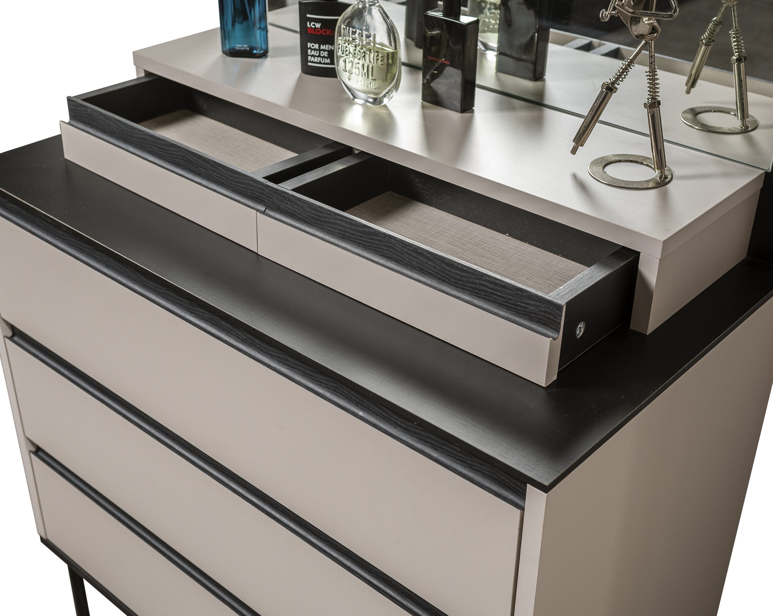 Bu şifonyerin en belirgin özelliklerinden biri, üst kısmında yer alan büyük, yuvarlak köşeli aynasıdır. Koyu renk çerçevesiyle şifonyerin genel tasarım dilini sürdüren şifonyer, hem pratik bir kullanım sunar hem de odaya derinlik ve ışık katar. Olympos Genç Odası Şifonyer, şifonyer Odası kategorisinde, hem gençlerin hem de yetişkinlerin modern ve düzenli bir yaşam alanı oluşturma arayışına mükemmel bir çözüm sunar.