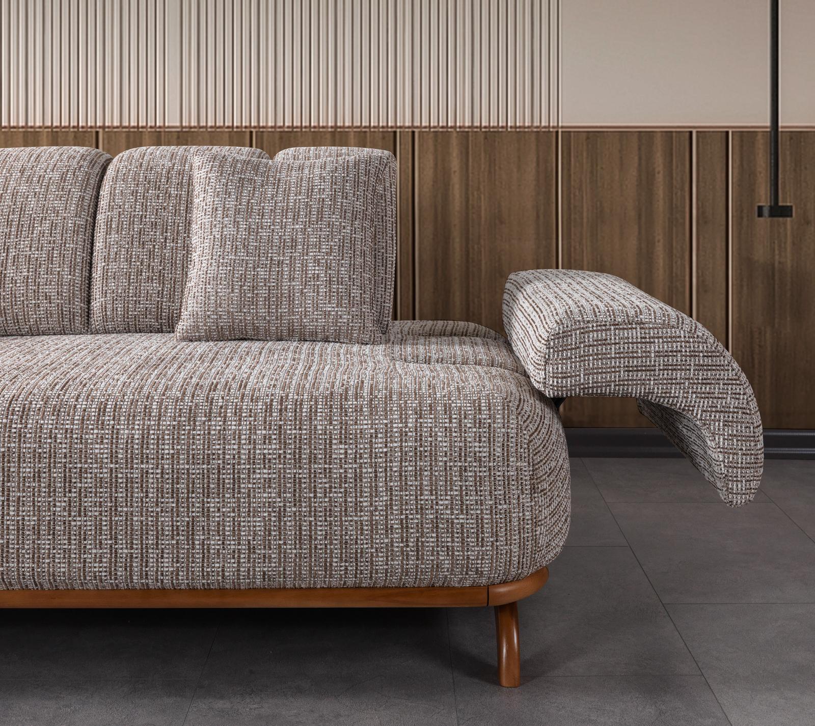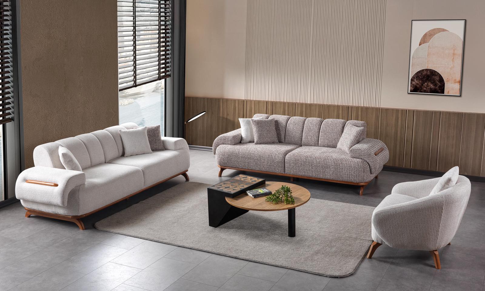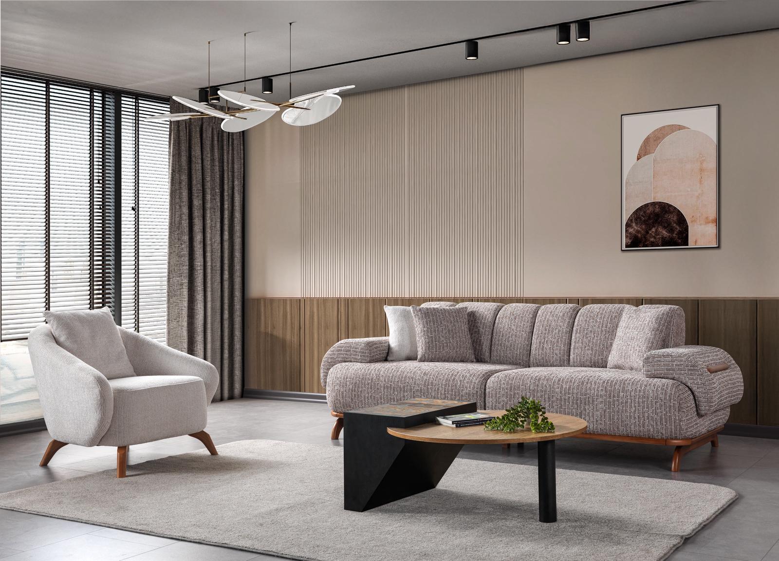 Salonunuzda ahşabın sıcaklığını ve modernizmin zarafetini bir araya getirin. [Ürün Adı] Koltuk Takımı, zarif ahşap kolçak detayları, kıvrımlı yumuşak hatları ve premium dokulu kumaşlarıyla evinize lüks bir görünüm kazandırır. Şık tasarımı kadar üstün oturum konforuyla da misafirlerinizi hayran bırakacak.