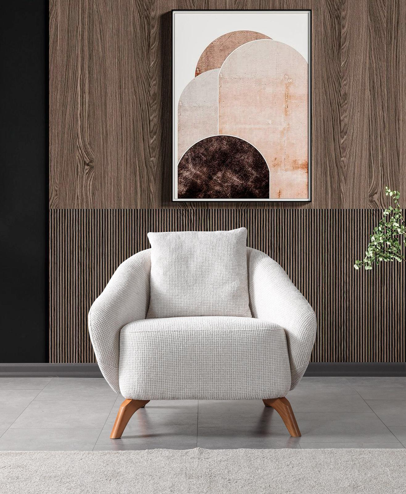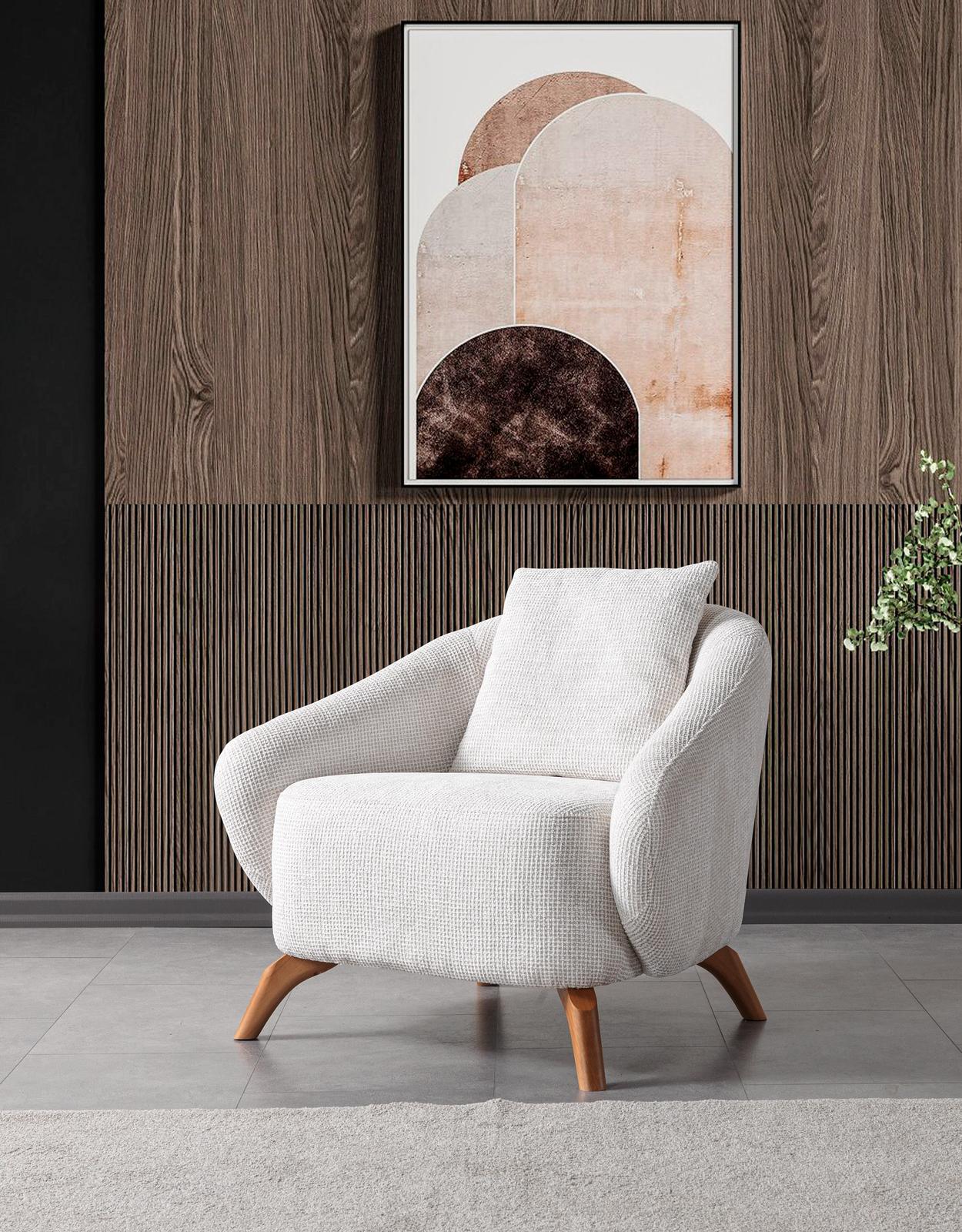 Takımı tamamlayan berjer, yuvarlak hatları, vücudu saran ergonomik yapısı ve zarif ahşap ayaklarıyla adeta kendi başına bir tasarım harikasıdır. Cam kenarında kitabınızı okurken veya günün yorgunluğunu atarken en sevdiğiniz köşeniz olmaya adaydır.