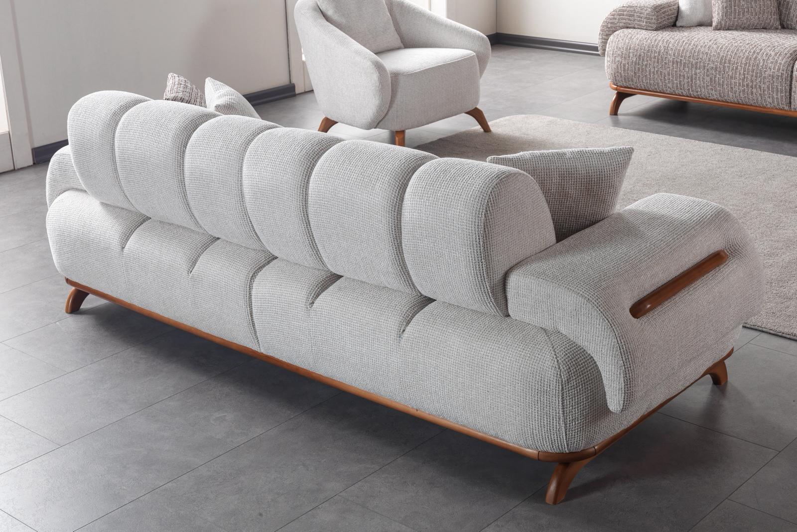Keskin köşelerden uzak, kıvrımlı ve yumuşak hatlara sahip yapısı, evinizde dingin bir enerji oluşturur. Üçlü koltuğun sırt bölümünde yer alan dikey dikiş detayları, hem şıklığı pekiştirir hem de sırtınızı tam kavrayarak ergonomik bir oturuş sağlar. İçeriğinde kullanılan yüksek yoğunluklu süngerler, uzun yıllar boyunca çökme yapmadan formunu korur ve bulutların üzerindeymiş hissi veren bir rahatlık sunar.