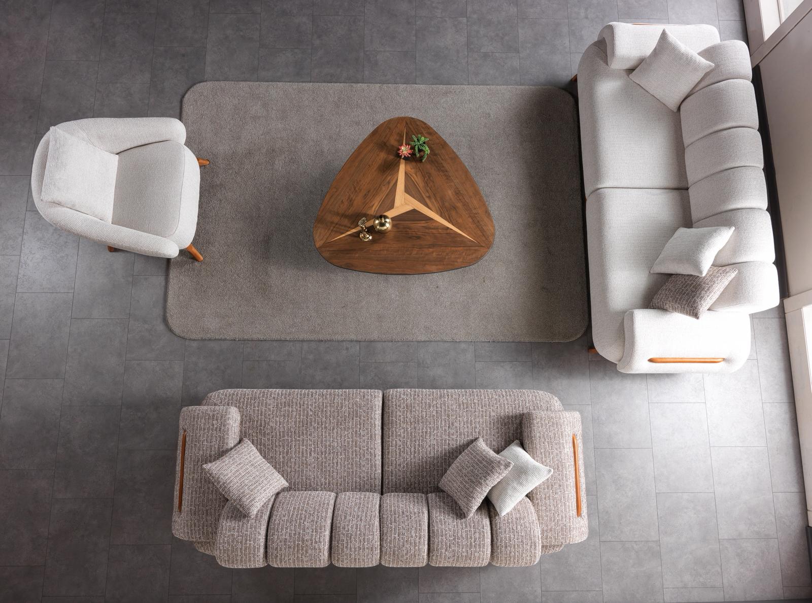 Bu takımın en çarpıcı özelliği, modern tasarıma sıcaklık katan doğal ahşap detaylarıdır. Kolçakların dış kısmına yerleştirilmiş zarif ahşap eklentiler ve koltuğun altını bir çizgi gibi saran ahşap baza, tasarıma benzersiz bir kimlik kazandırır. Görselde de fark edildiği üzere, farklı doku ve tonlardaki kumaşların aynı takımda kullanılması, mekana derinlik katarak tekdüzelikten uzak, “özel tasarım” bir atmosfer yaratır.
