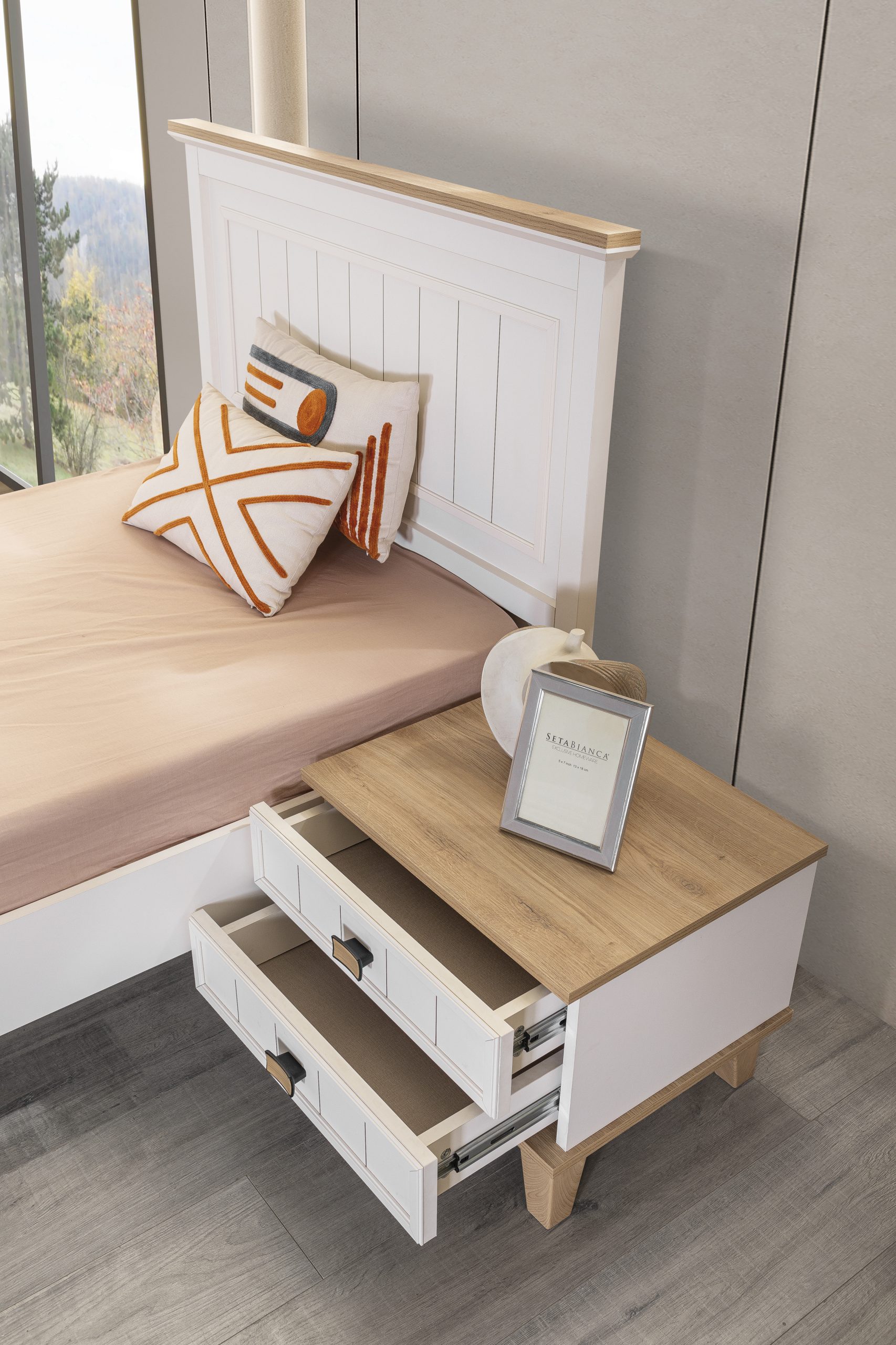 Pera Genç Odası Komidin, gençlerin dinamik yaşam tarzına uyum sağlayan modern ve estetik bir tasarıma sahiptir. Ürünün gövdesi ve çekmece önleri zarif beyaz renkte olup, çekmecelerde panelli/çerçeveli bir görünüm tercih edilmiştir. Bu detay, komidine sofistike bir hava katmaktadır. Üst tablası ve kısa, konik ayakları ise açık renkli, doğal ahşap dokulu bir görünüme sahiptir; bu renk kontrastı, ürüne sıcaklık ve modern bir şıklık kazandırır.