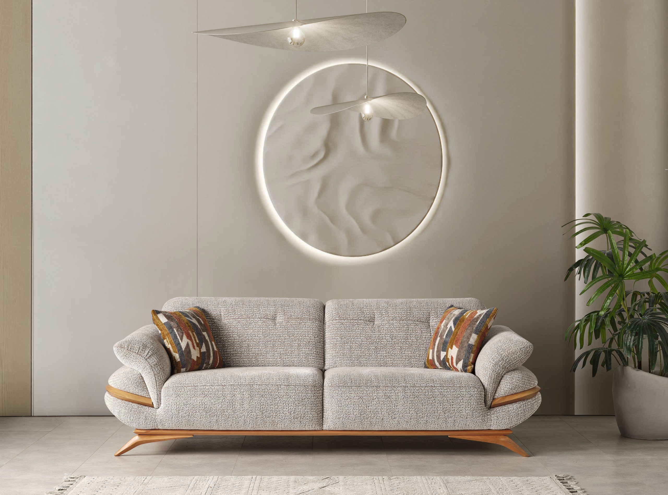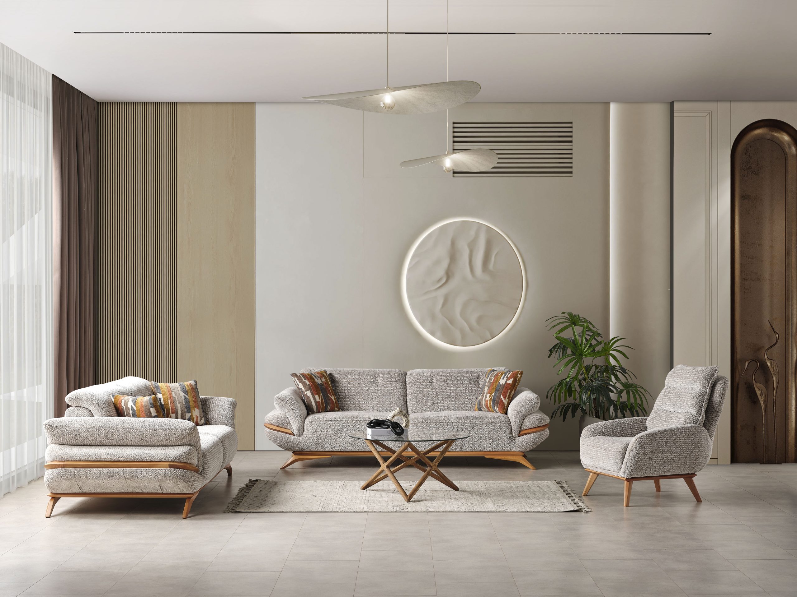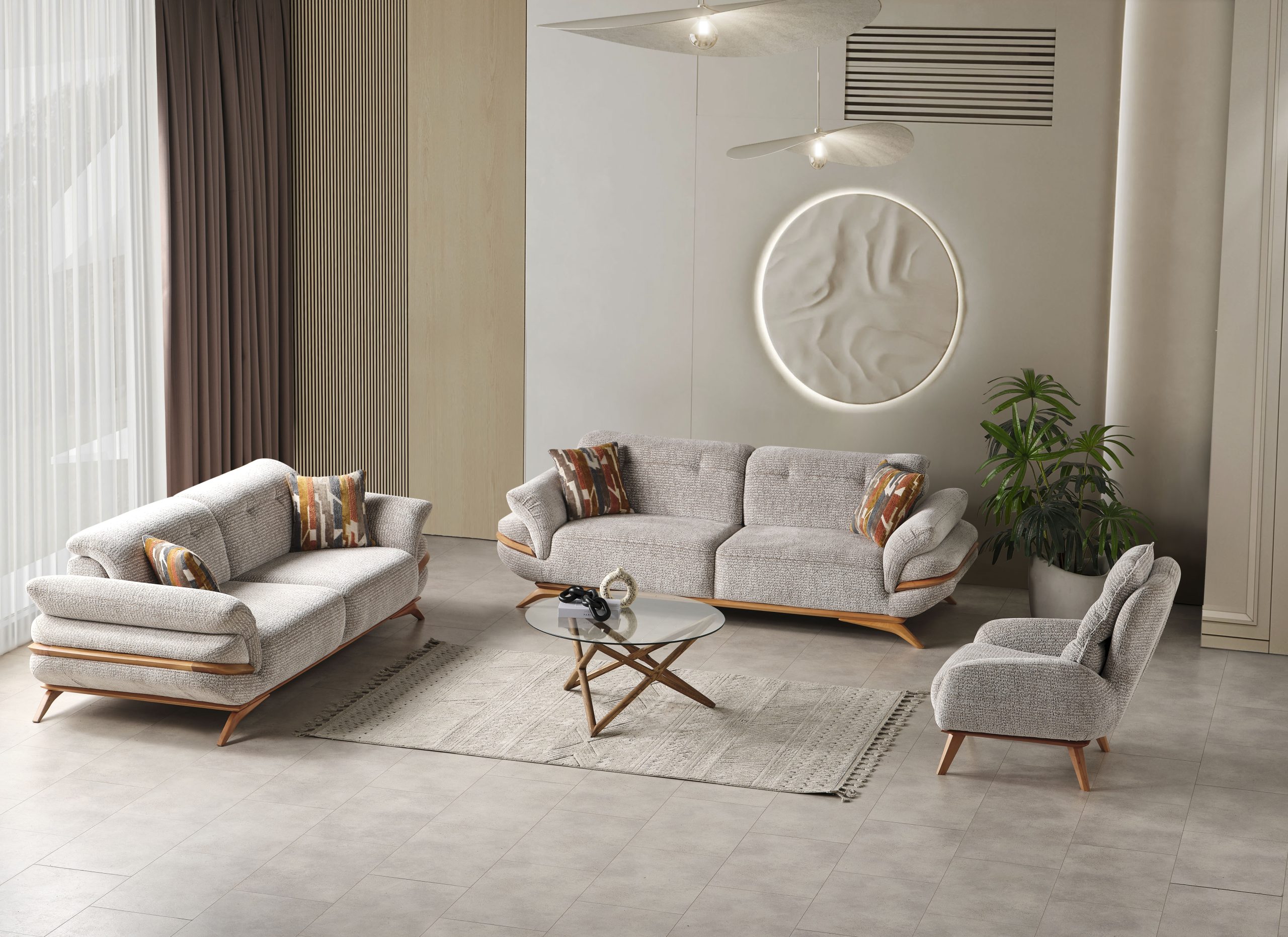 Riga Koltuk Takımı, modern yaşam alanlarının vazgeçilmezi olacak zarif ve şık bir tasarıma sahiptir. Yumuşak hatları ve dikkat çekici detaylarıyla öne çıkan bu koltuk takımı, konforlu oturma deneyimi sunarken odanıza sofistike bir hava katar. Açık renk tonları ve ahşap detayları ile modern stilin en güzel örneklerinden birini sergileyen Riga Koltuk Takımı, oturma odanızda sıcak ve davetkar bir atmosfer yaratır.