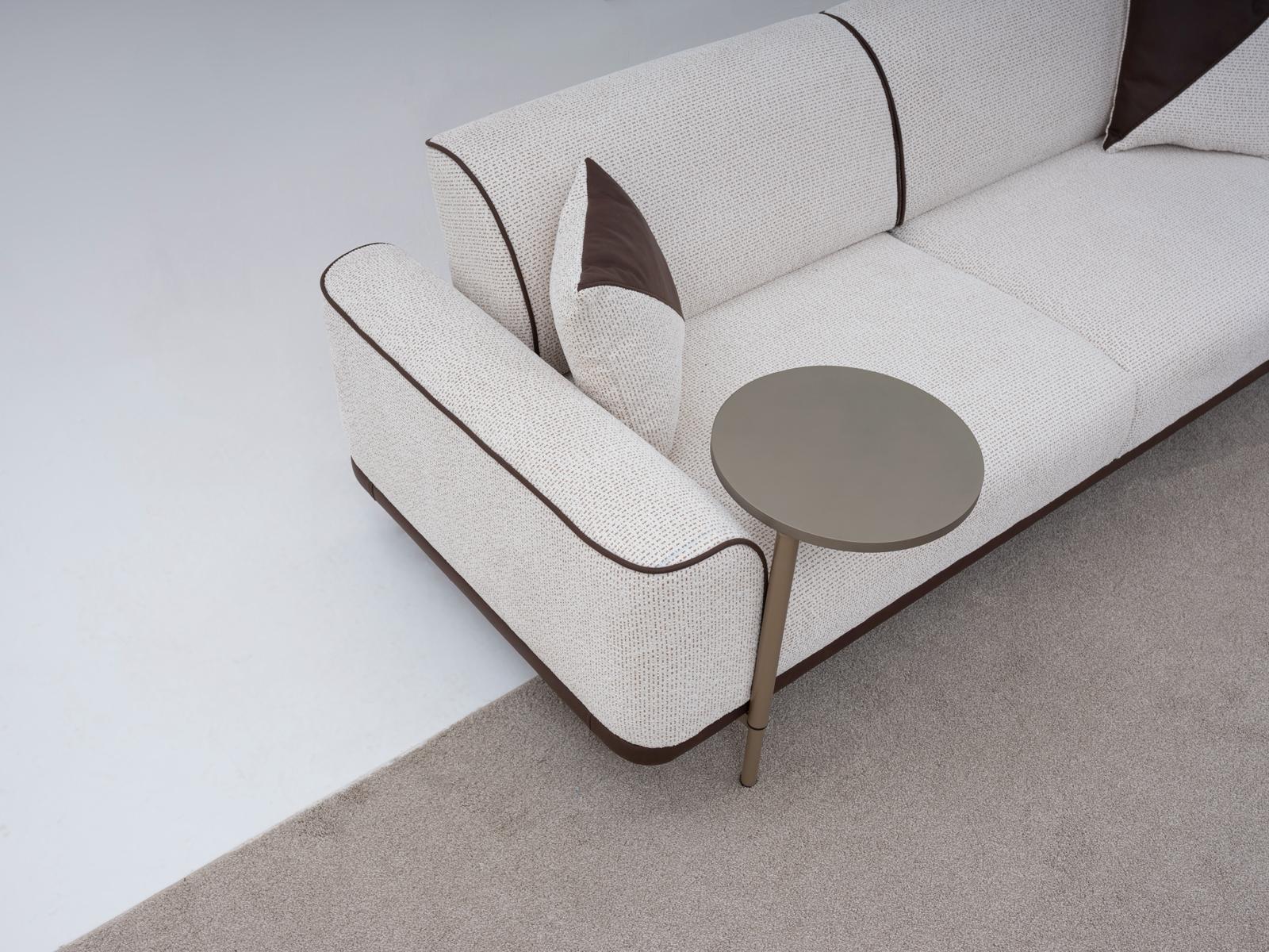 Bu koltuğu sıradan tasarımlardan ayıran en büyük özelliği, usta işi detaylarında gizli. Açık renkli, kaliteli dokuma kumaşın etrafını saran koyu kahverengi şerit (biye) detayları, koltuğun formunu vurgulayarak adeta bir resim çerçevesi gibi asil bir görünüm yaratır. Aynı kahverengi detayın alt bazada da devam etmesi, tasarıma kusursuz bir bütünlük sağlar.