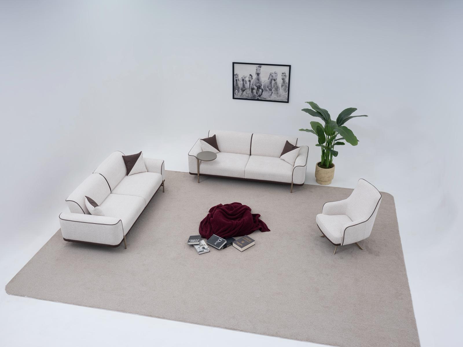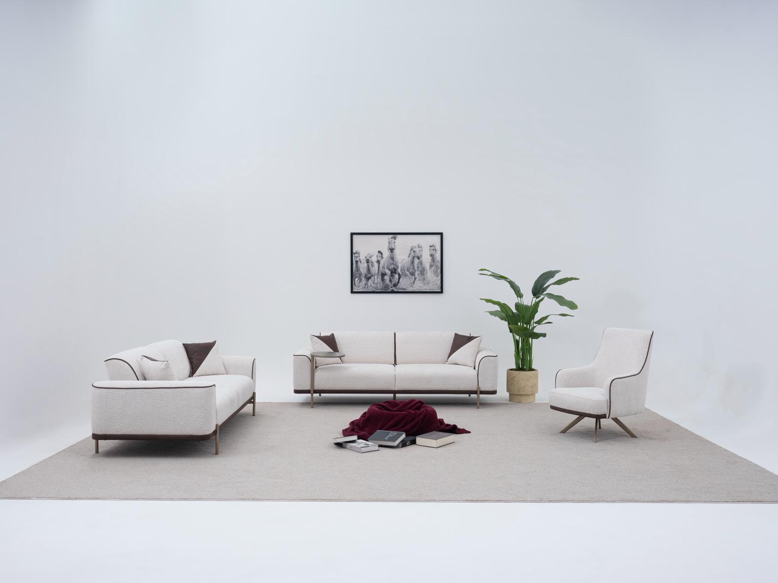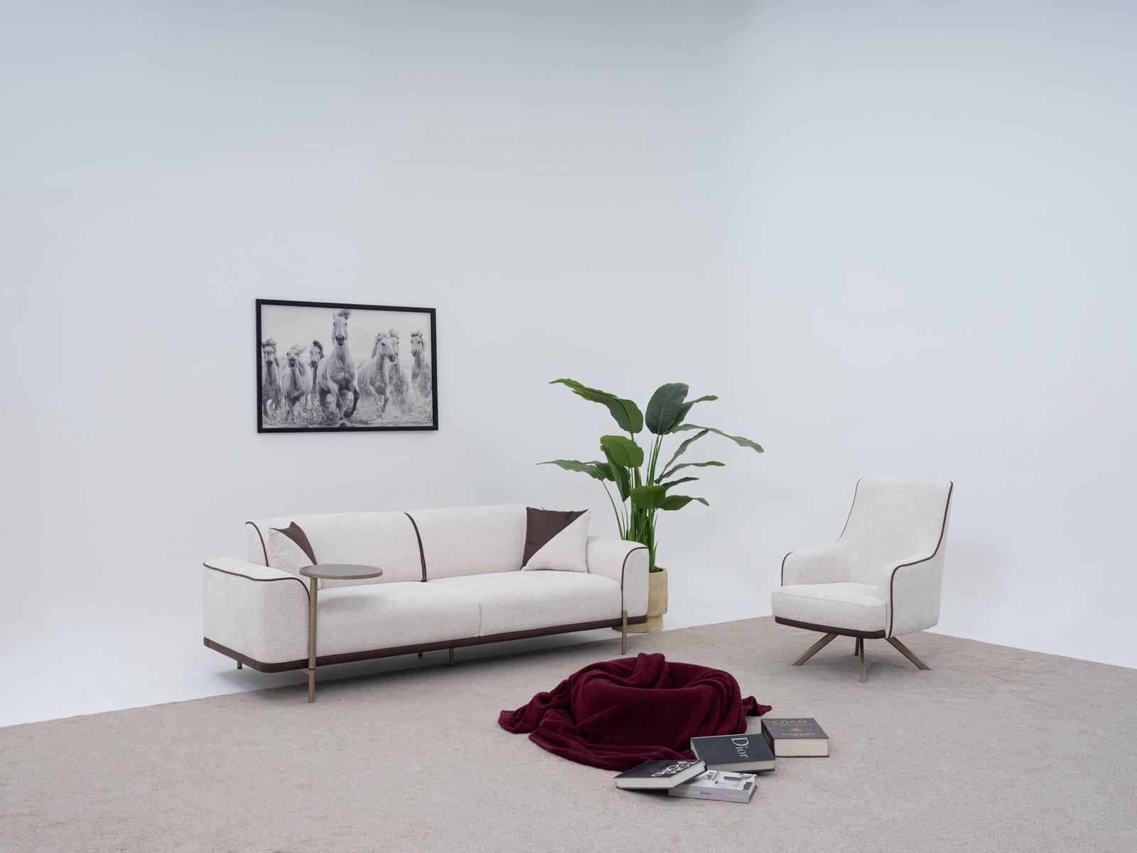 Takımın açık renkli, ferahlatıcı kumaş dokusu, hatlarını belirginleştiren koyu renk (bronz/koyu kahve) biye detaylarıyla kusursuz bir tezatlık yakalıyor. Sadece kumaşla sınırlı kalmayan bu zarafet, koltuğun alt kısmını boydan boya saran incecik metal kasa ve zarif ayaklarla tamamlanıyor. Bu tasarım detayı, koltuklara hantal bir görünüm yerine, mekanda süzülüyormuş gibi hafif ve zarif bir duruş kazandırıyor.