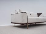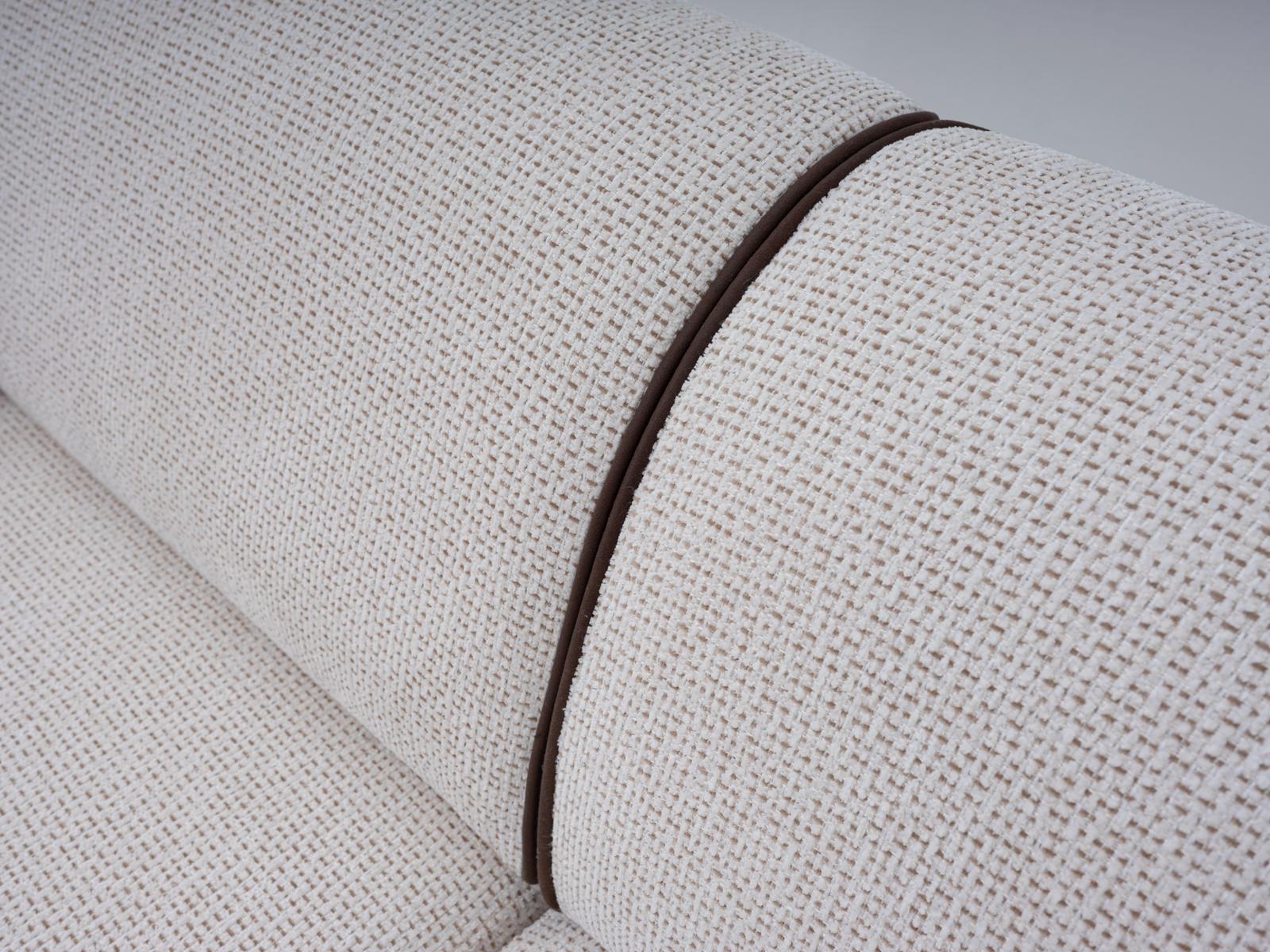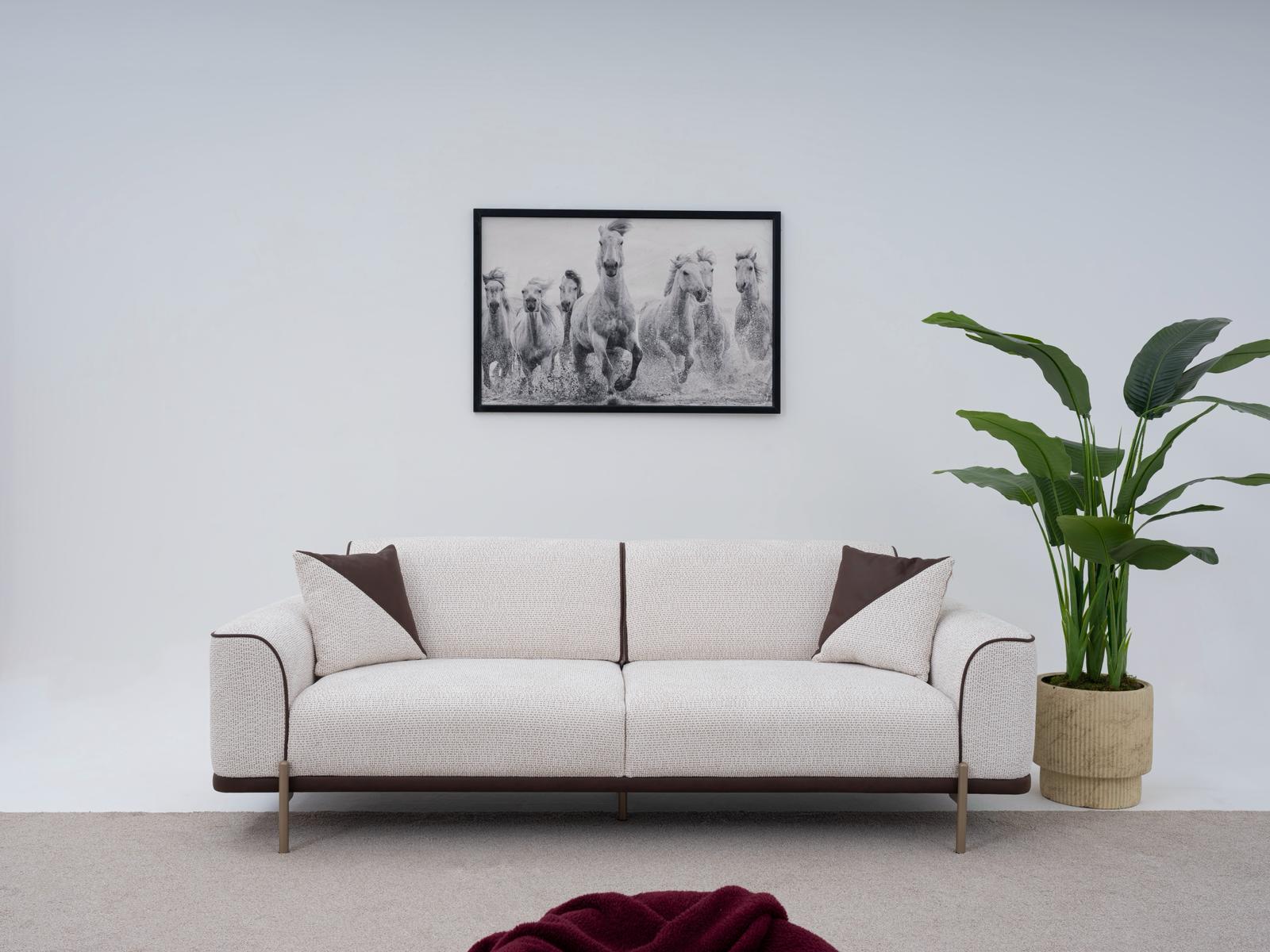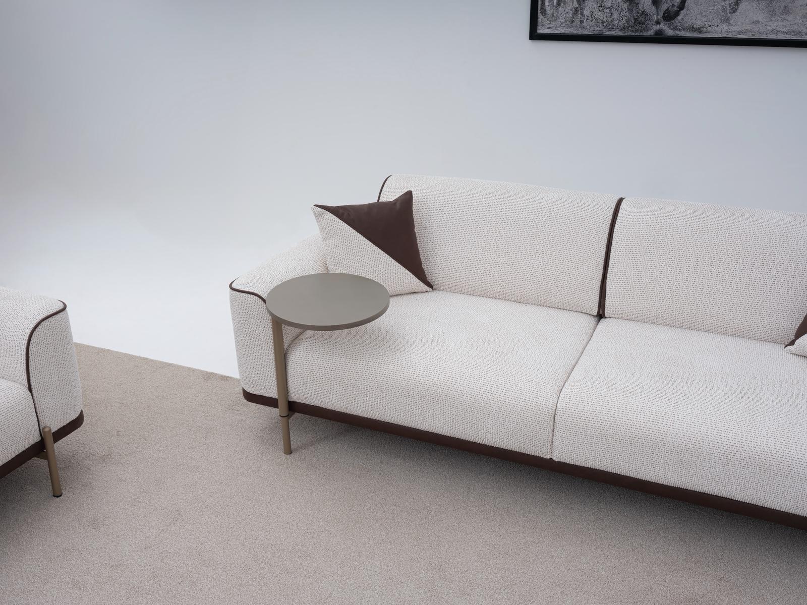 Takımın açık renkli, ferahlatıcı kumaş dokusu, hatlarını belirginleştiren koyu renk (bronz/koyu kahve) biye detaylarıyla kusursuz bir tezatlık yakalıyor. Sadece kumaşla sınırlı kalmayan bu zarafet, koltuğun alt kısmını boydan boya saran incecik metal kasa ve zarif ayaklarla tamamlanıyor. Bu tasarım detayı, koltuklara hantal bir görünüm yerine, mekanda süzülüyormuş gibi hafif ve zarif bir duruş kazandırıyor.