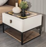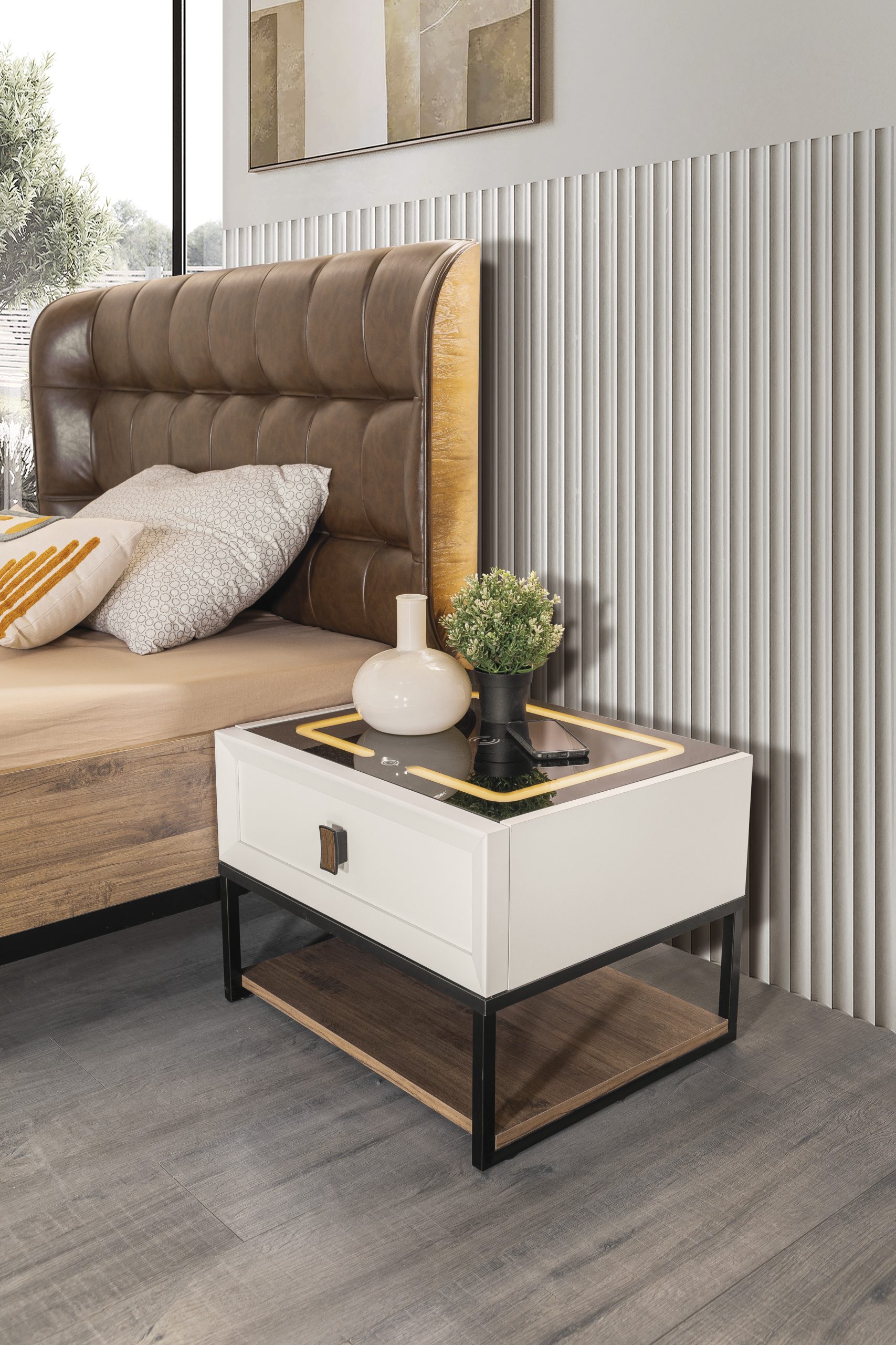 Komidinin sağlamlığını ve endüstriyel şıklığını vurgulayan, dayanıklı siyah metalden oluşan iskelet yapısı, alt kısımda geniş bir ahşap görünümlü rafı destekler. Bu açık raf, kitaplar, dergiler veya dekoratif objeler için ek bir kullanım alanı sunar. Ürünün en dikkat çekici özelliği ise parlak siyah camdan oluşan üst yüzeyidir. Bu cam panelin altında yer alan sarı renkli LED aydınlatma, ambiyansı zenginleştirirken, entegre kablosuz şarj alanı ise akıllı cihazlarınızı kolayca şarj etmenize olanak tanır. Trio Genç Odası Komidin, genç odalarına modern bir stil ve akılcı çözümlerle fonksiyonellik katmak üzere tasarlanmıştır.