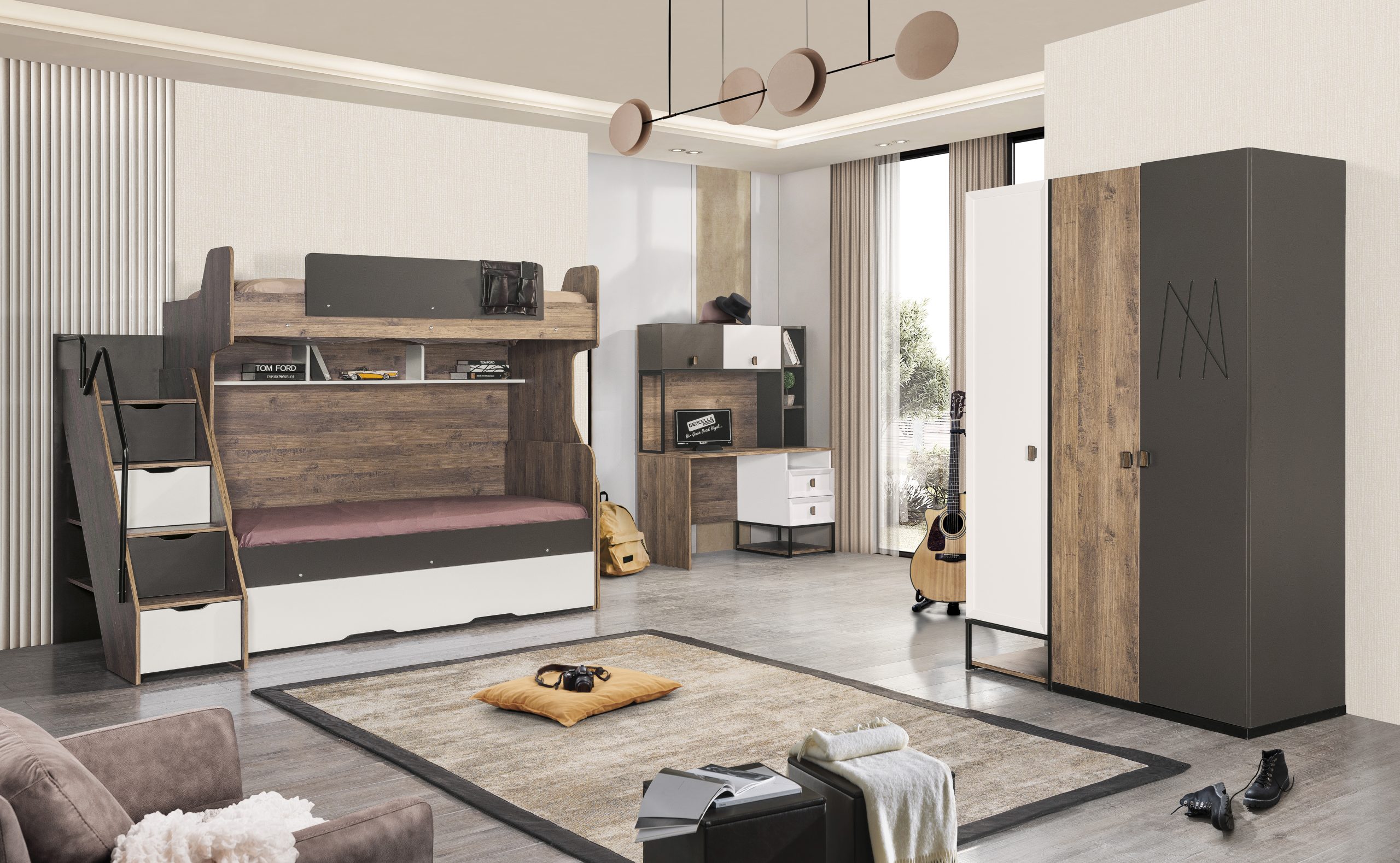 Takımın kalbinde yer alan ranzalı yapı, odanın dikey alanını verimli kullanarak iki genç odası takımı kapasitesi sunar. Alt katta bulunan yatağın yanı başında konumlandırılmış entegre çalışma masası, gençlerin ders çalışabileceği veya hobileriyle ilgilenebileceği geniş ve düzenli bir alan sağlar. Çalışma masasının üzerinde ve çevresinde, kitaplar, dekoratif objeler veya kişisel eşyalar için ideal depolama imkanı sunan açık raflar ve çekmeceler bulunmaktadır. Ranzaya erişimi sağlayan merdiven bölümü, aynı zamanda çekmeceli depolama birimleriyle zenginleştirilmiştir; bu akılcı tasarım, eşyaların düzenli bir şekilde saklanmasına olanak tanır ve odaya düzenli bir görünüm kazandırır. Çekmecelerin ve merdiven basamaklarının bazıları beyaz, bazıları ise koyu gri renklerde tasarlanarak ürünün modern ve dinamik estetiği pekiştirilmiştir. Genç odası kullanımına özel olarak geliştirilen bu takım, fonksiyonelliği ve şıklığı bir araya getirerek gençlerin kişisel alanlarını en iyi şekilde değerlendirmelerine yardımcı olur.