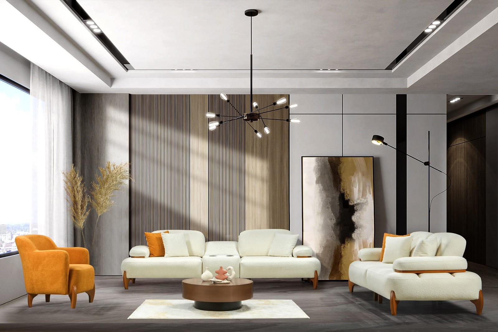 Venedik Koltuk Takımı, çağdaş tasarım anlayışını işlevsellikle birleştiren, göz alıcı bir oturma grubudur. Bu özel Koltuk Takımı, krem rengi ana üniteleri ve canlı turuncu tekli koltuğuyla mekanınıza dinamik bir hava katarken, modern stilin zarif dokunuşlarını sunar.