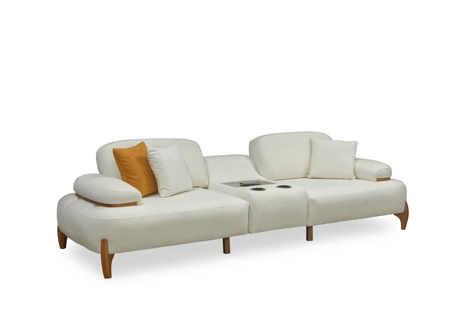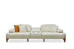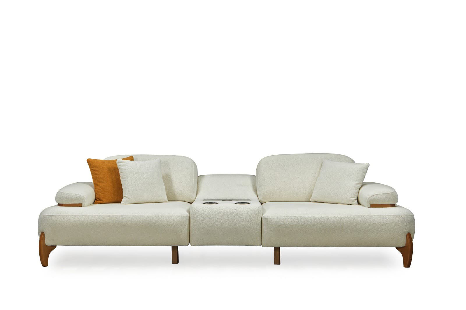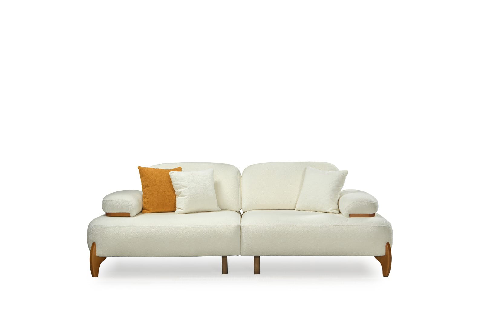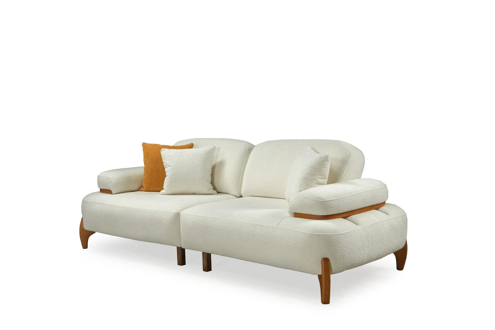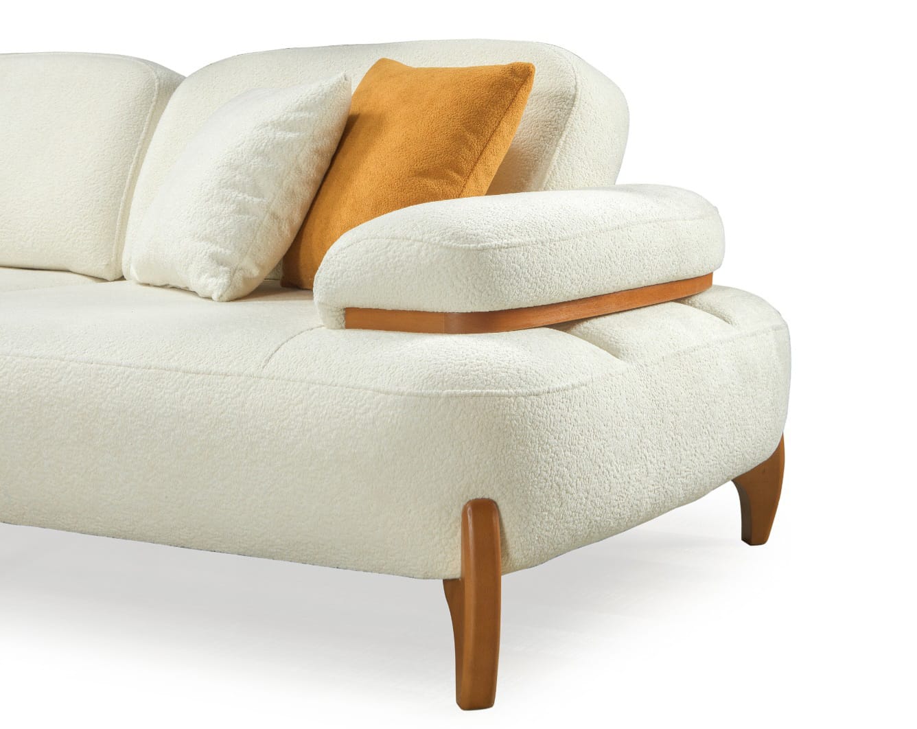 Takımın ana parçaları, yumuşak dokulu ve davetkar krem rengi kumaşlarıyla öne çıkar. Geniş ve yuvarlak hatlı kolçaklar, konforlu bir oturma deneyimi sunarken, bazı kolçaklarda bulunan ahşap detaylar tasarıma doğal bir sıcaklık ve sofistike bir dokunuş ekler. Sağlam ve estetik ahşap ayaklar, takımın modern görünümünü tamamlar ve yerden yüksek yapısıyla temizliği kolaylaştırır. koltuk takımı olarak konumlandırılan turuncu tekli koltuk, takımın genel estetiğine canlı bir kontrast ve enerji katarak yaşam alanınıza özgün bir karakter kazandırır.