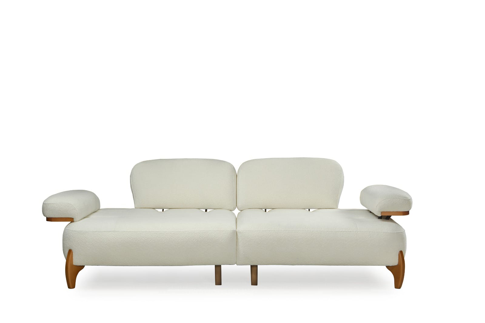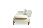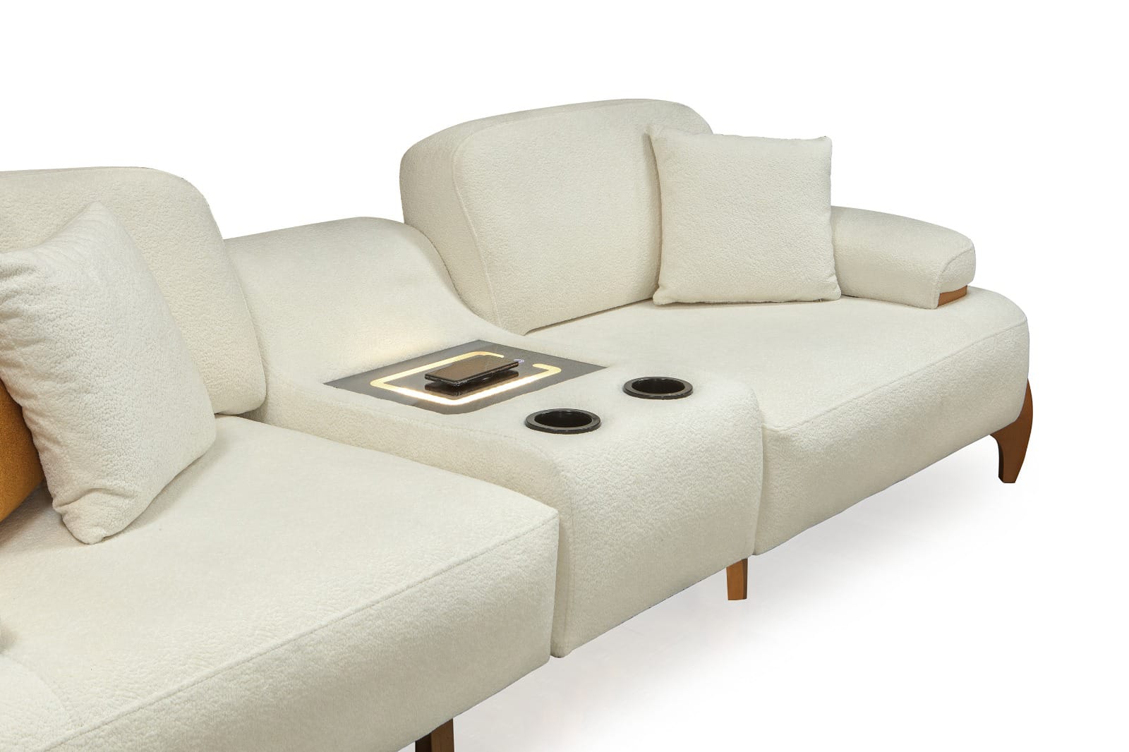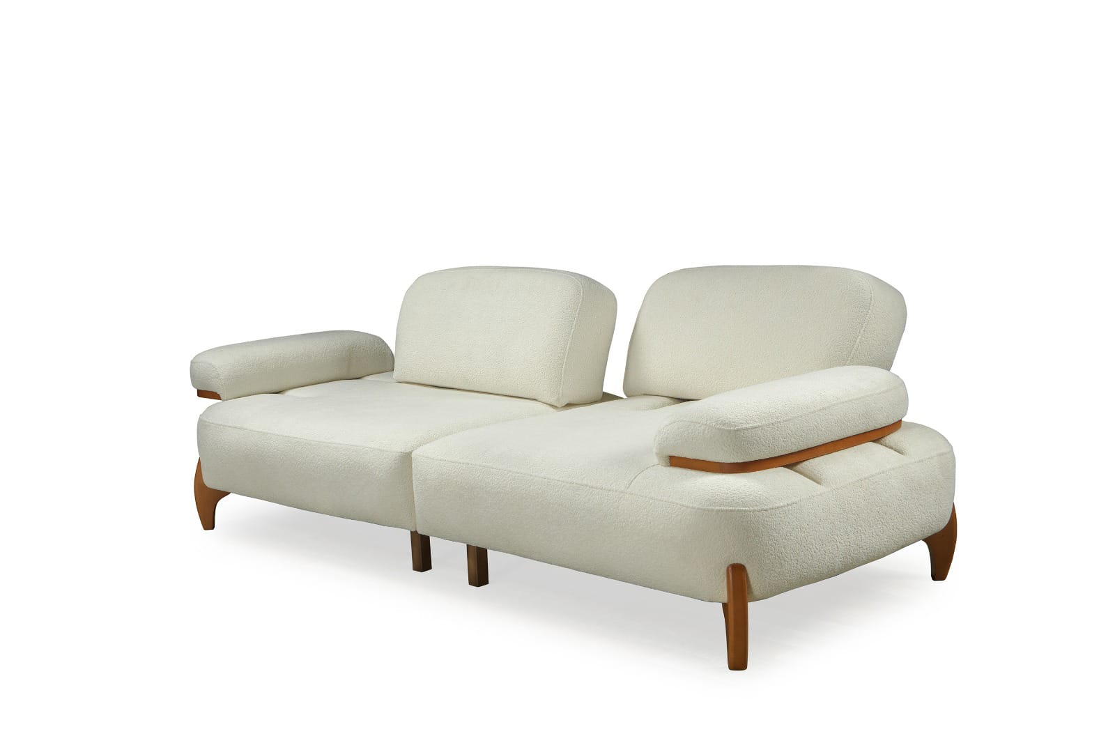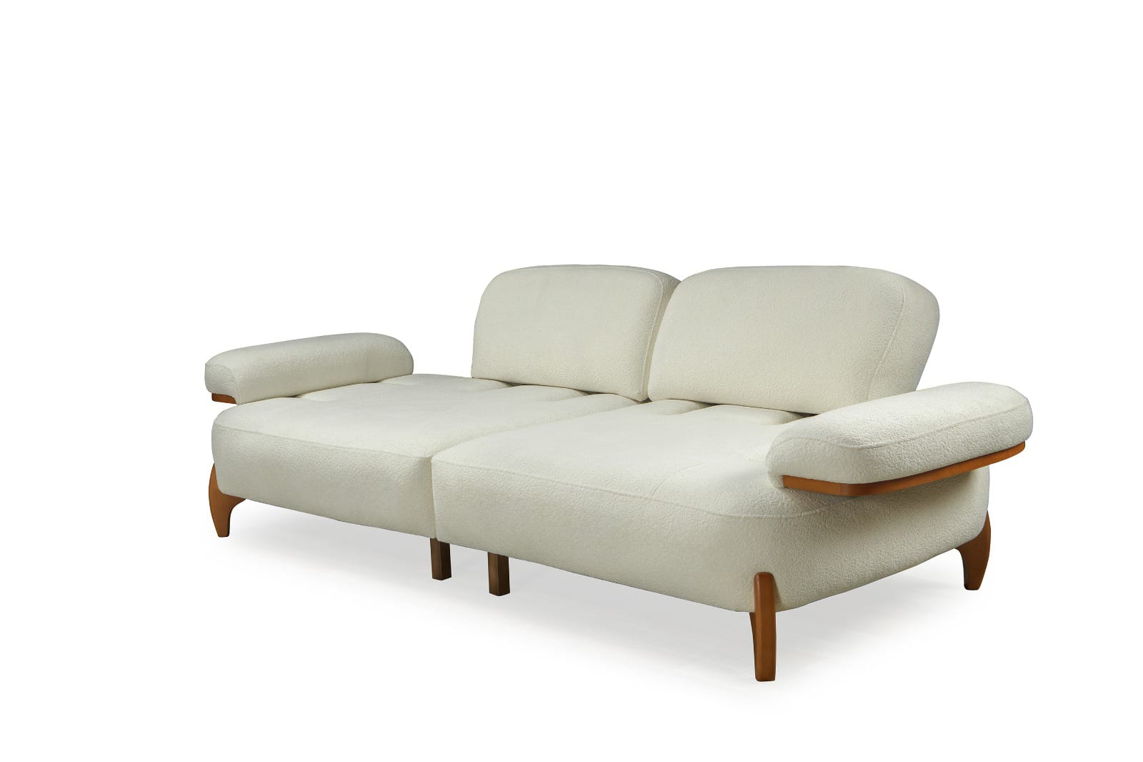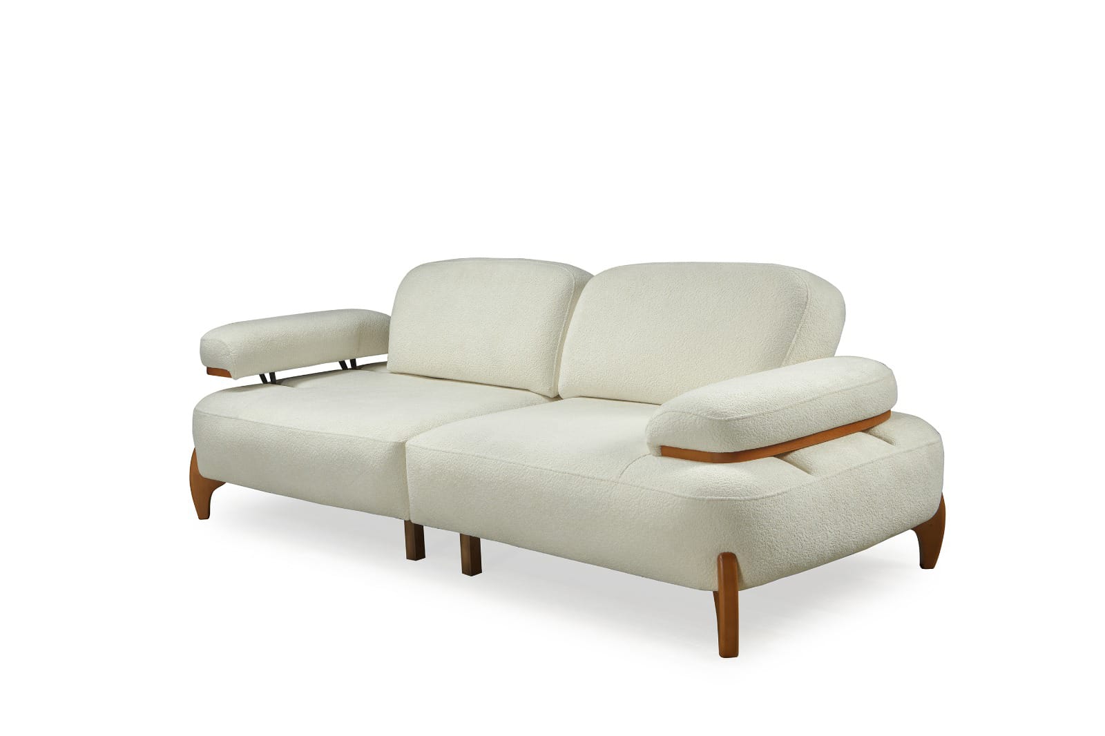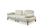 Takımın ana parçaları, yumuşak dokulu ve davetkar krem rengi kumaşlarıyla öne çıkar. Geniş ve yuvarlak hatlı kolçaklar, konforlu bir oturma deneyimi sunarken, bazı kolçaklarda bulunan ahşap detaylar tasarıma doğal bir sıcaklık ve sofistike bir dokunuş ekler. Sağlam ve estetik ahşap ayaklar, takımın modern görünümünü tamamlar ve yerden yüksek yapısıyla temizliği kolaylaştırır. koltuk takımı olarak konumlandırılan turuncu tekli koltuk, takımın genel estetiğine canlı bir kontrast ve enerji katarak yaşam alanınıza özgün bir karakter kazandırır.